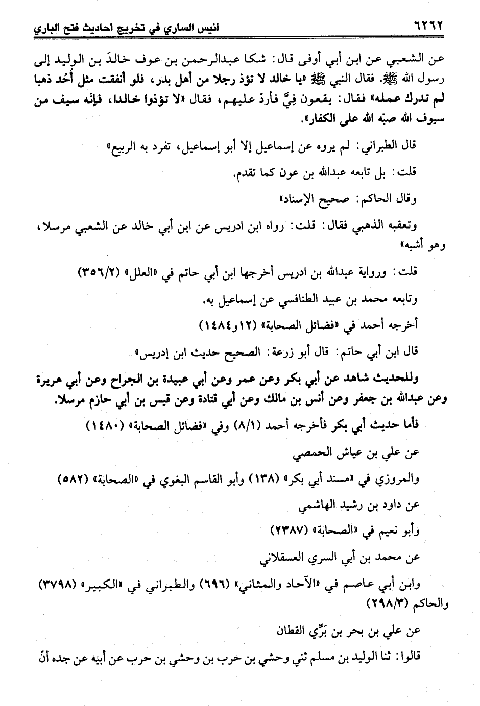 عن الشعبي عن ابن أبي أوفى قال: شكا عبد الرحمن بن عوف خالدَ بن الوليد إلى رسول الله -صلى الله عليه وسلم-. فقال النبي-صلى الله عليه وسلم- "يا خالد لا تؤذ رجلًا من أهل بدر، فلو أنفقت مثل أُحُد ذهبا لم تدرك عمله" فقال: يقعون فِيَّ فأردّ عليهم، فقال "لا تؤذوا خالدا، فإنّه سيف من سيوف الله صبّه الله على الكفار".