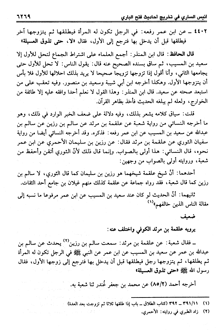 4402 - عن ابن عمر رفعه: في الرجل تكون له المرأة فيطلقها ثم يتزوجها آخر فيطلقها قبل أن يدخل بها فترجع إلى الأول، فقال "لا، حتى تذوق العسيلة"