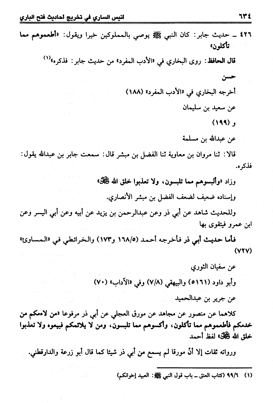 426 - حديث جابر: كان النبي - صلى الله عليه وسلم - يوصي بالمملوكين خيرا ويقول: "أطعموهم مما تأكلون"