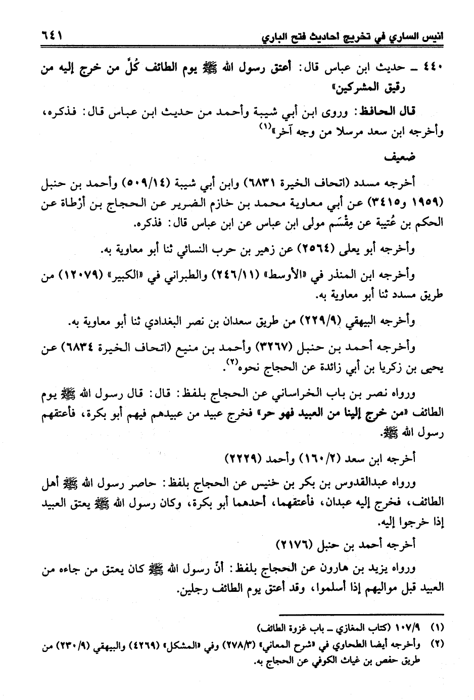 440 - حديث ابن عباس قال: أعتق رسول الله - صلى الله عليه وسلم - يوم الطائف كُلَّ من خرج إليه من رقيق المشركين"