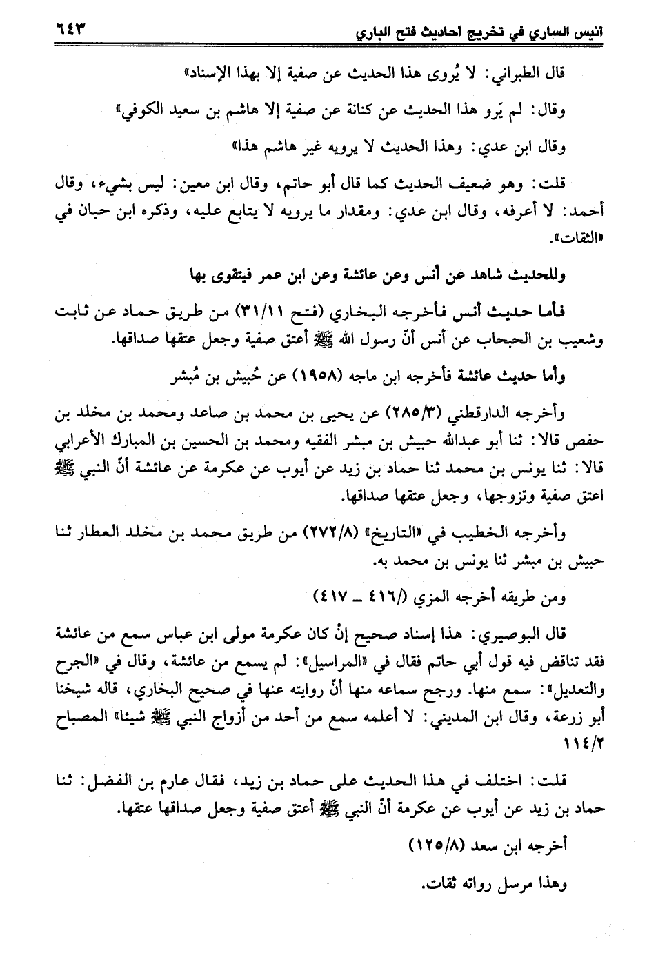 وأخرجه الدارقطني (3/ 285) عن يحيى بن مُحَمَّدْ بن صاعد ومحمد بن مخلد بن حفص قالا: ثنا أبو عبد الله حبيش بن مبشر الفقيه ومحمد بن الحسين بن المبارك الأعرابي قالا: ثنا يونس بن مُحَمَّدْ ثنا حماد بن زيد عن أيوب عن عكرمة عن عائشة أنّ النبي - صلى الله عليه وسلم - اعتق صفية وتزوجها، وجعل عتقها صداقها.