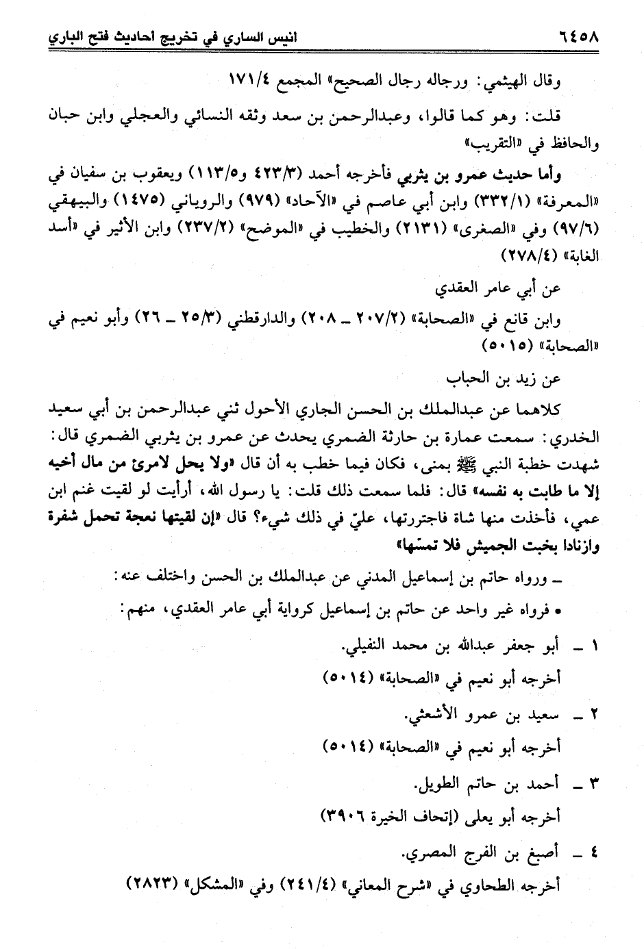 كلاهما عن عبد الملك بن الحسن الجاري الأحول ثني عبد الرحمن بن أبي سعيد الخدري: سمعت عمارة بن حارثة الضمري يحدث عن عمرو بن يثربي الضمري قال: شهدت خطبة النبي-صلى الله عليه وسلم- بمنى، فكان فيما خطب به أن قال "ولا يحل لامرئ من مال أخيه إلا ما طابت به نفسه" قال: فلما سمعت ذلك قلت: يا رسول الله، أرأيت لو لقيت غنم ابن عمي، فأخذت منها شاة فاجتررتها، عليّ في ذلك شيء؟ قال "إن لقيتها نعجة تحمل شفرة وازنادا بخبت الجميش فلا تمسّها"