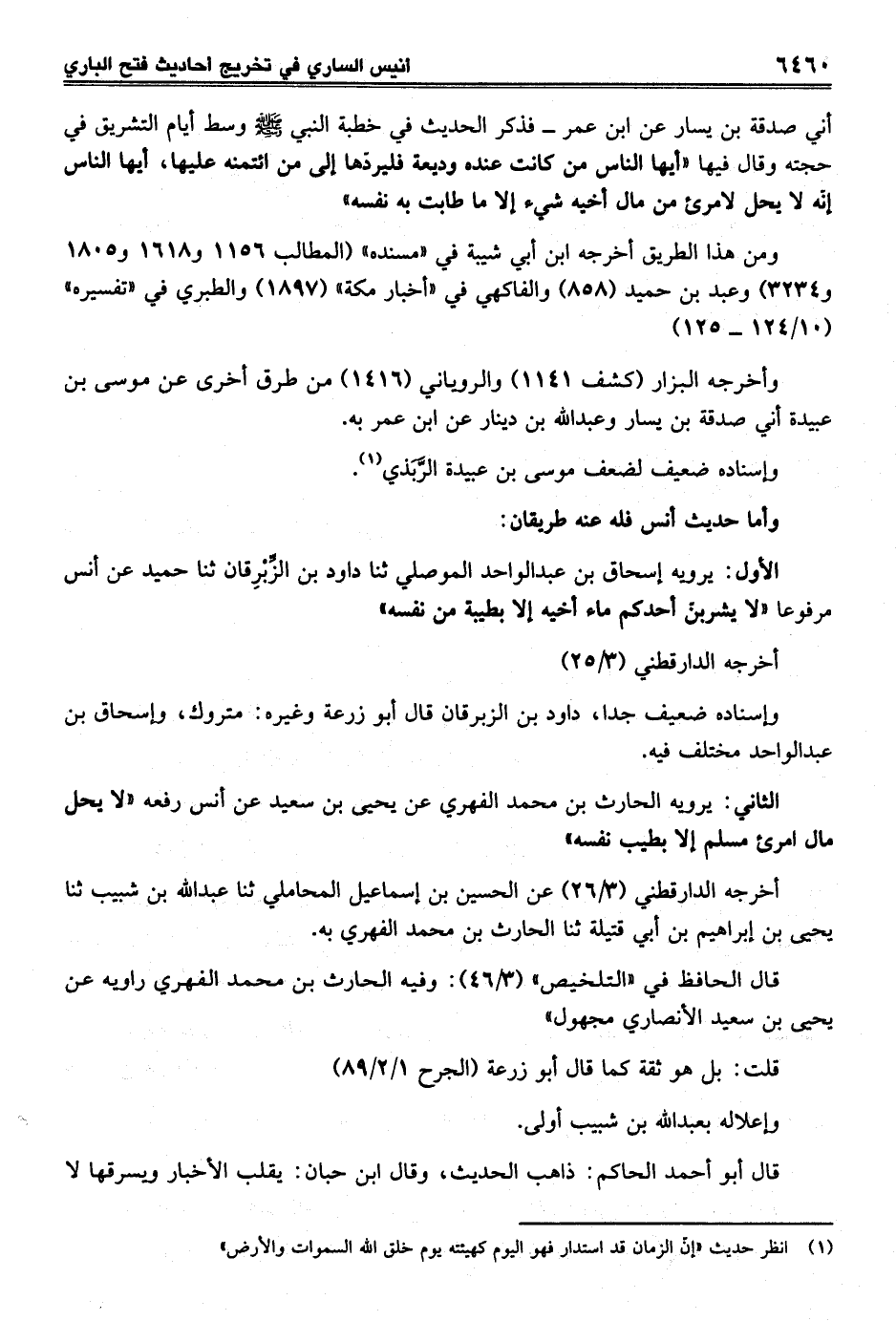 أني صدقة بن يسار عن ابن عمر- فذكر الحديث في خطبة النبي-صلى الله عليه وسلم-وسط أيام التشريق في حجته وقال فيها "أيها الناس من كانت عنده وديعة فليردها إلى من ائتمنه عليها، أيها الناس إنّه لا يحل لامرئ من مال أخيه شيء إلا ما طابت به نفسه"