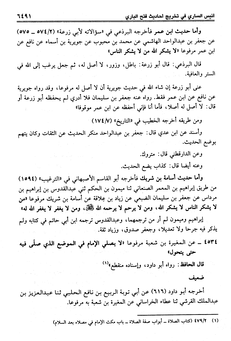 وأما حديث ابن عمر فأخرجه البرذعي في "سؤالاته لأبي زرعة" (2/ 574 - 575) عن جعفر بن عبد الواحد الهاشمي عن محمد بن محبوب عن جويرية بن أسماء عن نافع عن ابن عمر مرفوعا "لا يشكر الله من لا يشكر الناس"