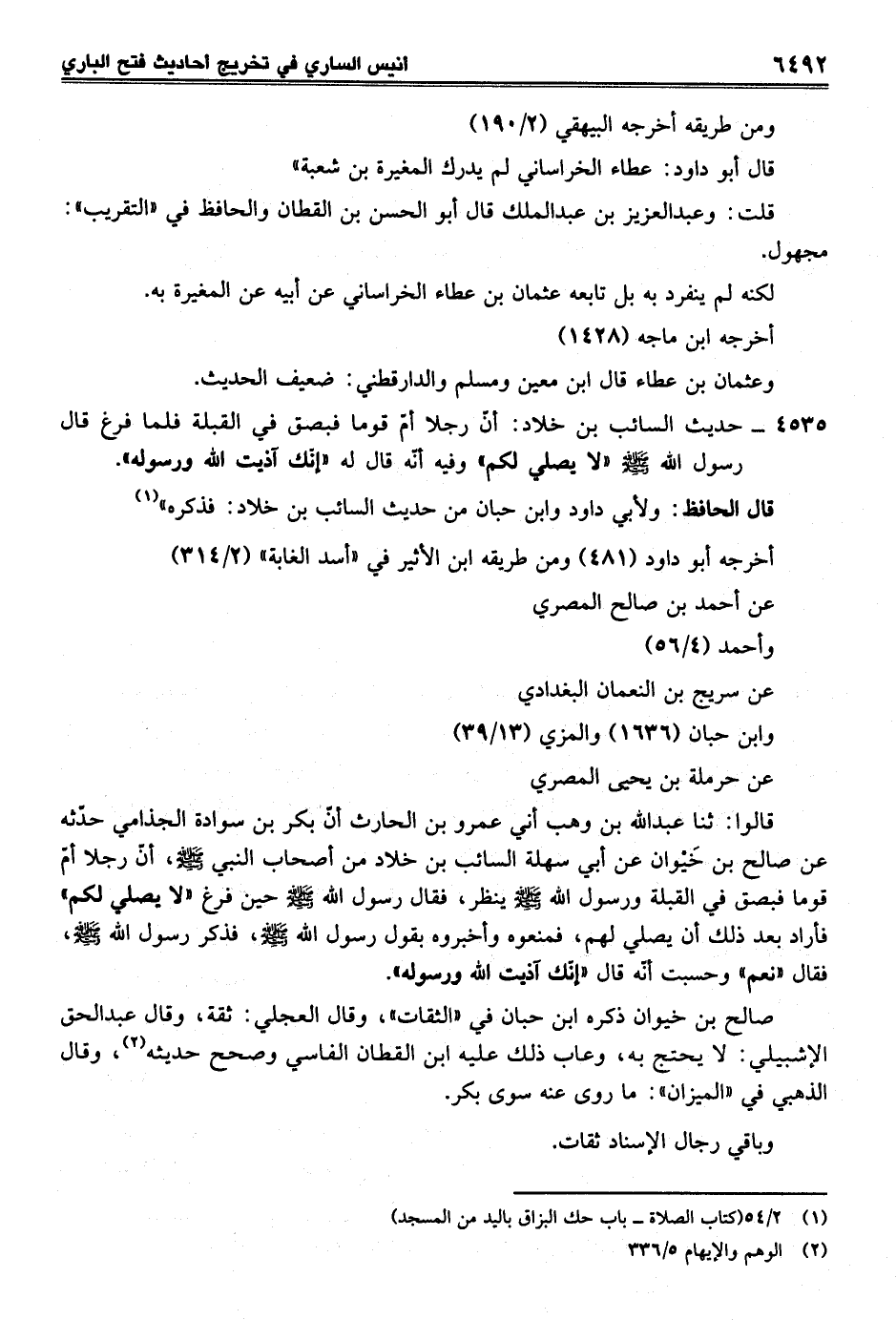 4535 - حديث السائب بن خلاد: أنّ رجلًا أمّ قوما فبصق في القبلة فلما فرغ قال رسول الله -صلى الله عليه وسلم- "لا يصلي لكم" وفيه أنّه قال له "إنّك آذيت الله ورسوله".