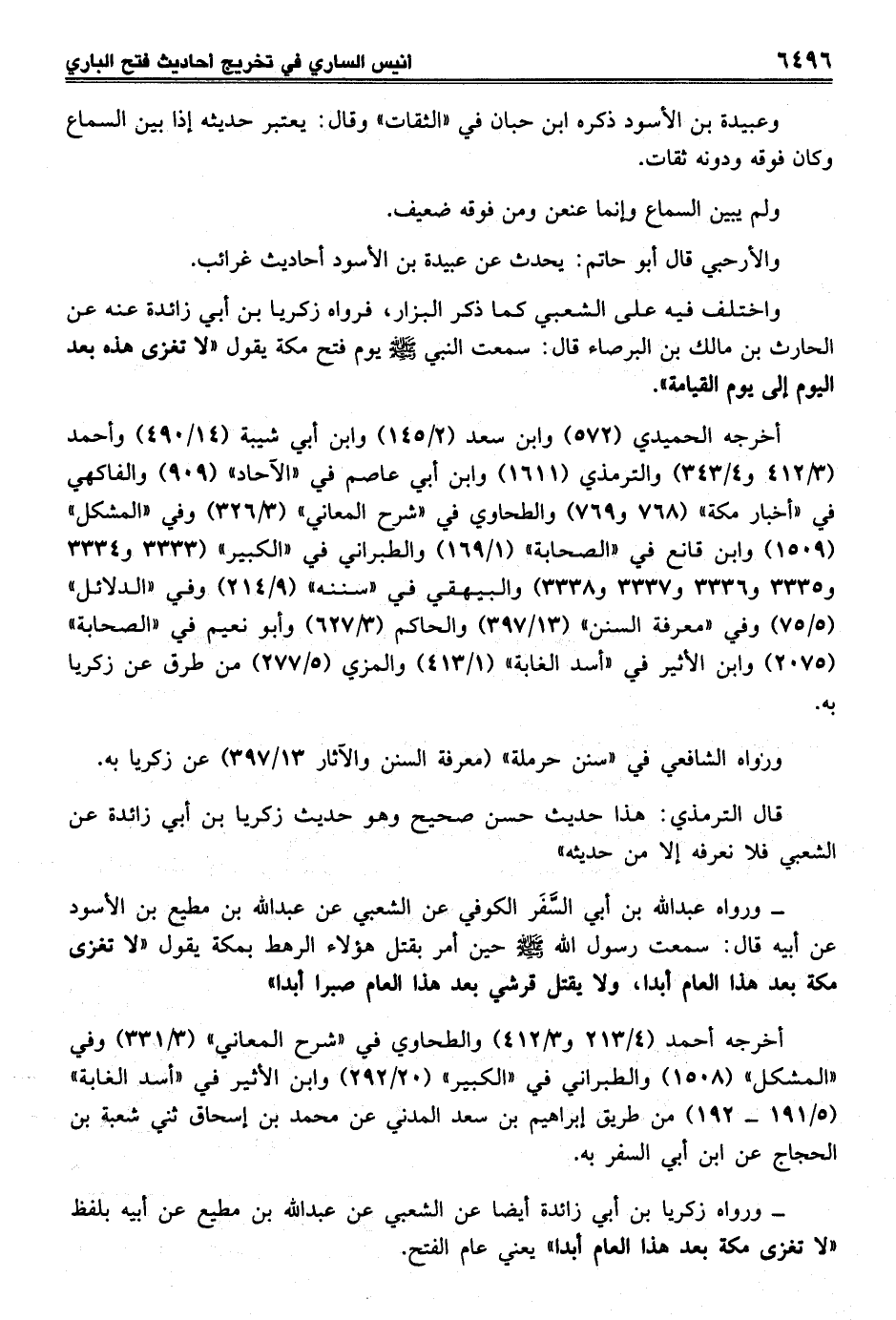 - ورواه زكريا بن أبي زائدة أيضًا عن الشعبي عن عبد الله بن مطيع عن أبيه بلفظ "لا تغزى مكة بعد هذا العام أبدا" يعني عام الفتح.