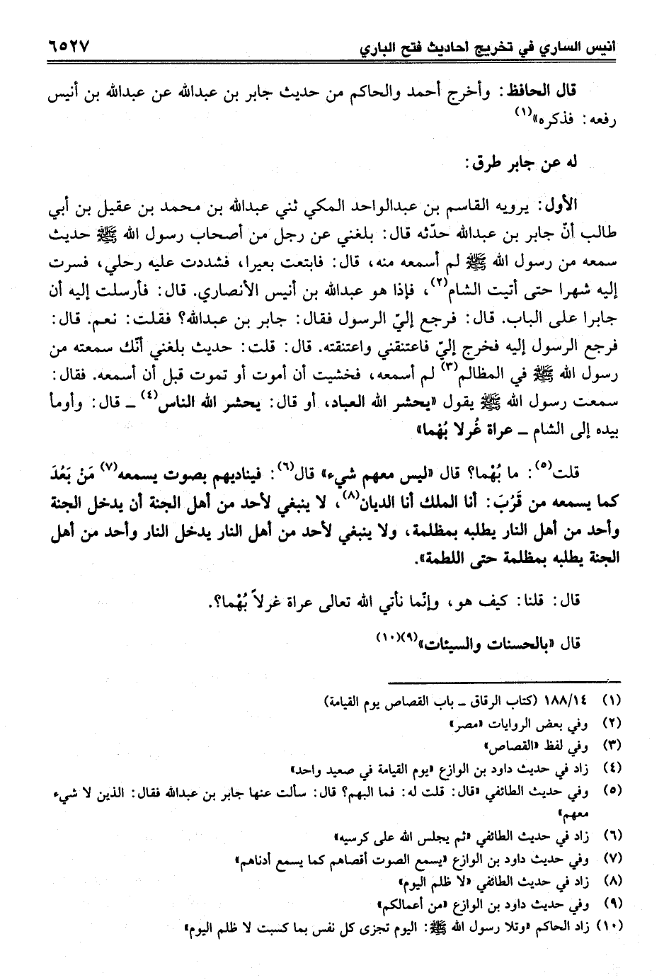 قال الحافظ: وأخرج أحمد والحاكم من حديث جابر بن عبد الله عن عبد الله بن أنيس رفعه: فذكره" (¬1)