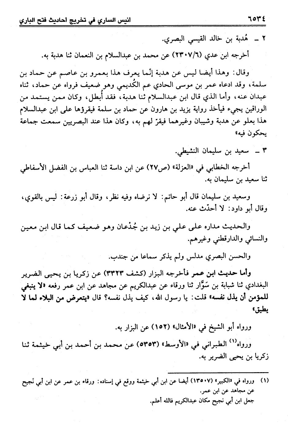 وقال: وهذا أيضًا ليس عن هدبة إنّما يعرف هذا بعمرو بن عاصم عن حماد بن سلمة، وقد ادعاه عمر بن موسى الحادي عم الكُديمي وهو ضعيف فرواه عن حماد، ثناه عبدان عنه، وأما الذي قال ابن عبد السلام ثنا هدبة، فقد أُبطل، وكان ممن يستمد من الوراقين يجيء فيأخذ رواية يزيد بن هارون عن حماد بن سلمة فيقرؤها على ابن عبد السلام هذا بعلو عن هدبة وشيبان وغيرهما فيقرّ لهم به، وكان هذا عند البصريين سمعت جماعة يحكون فيه"