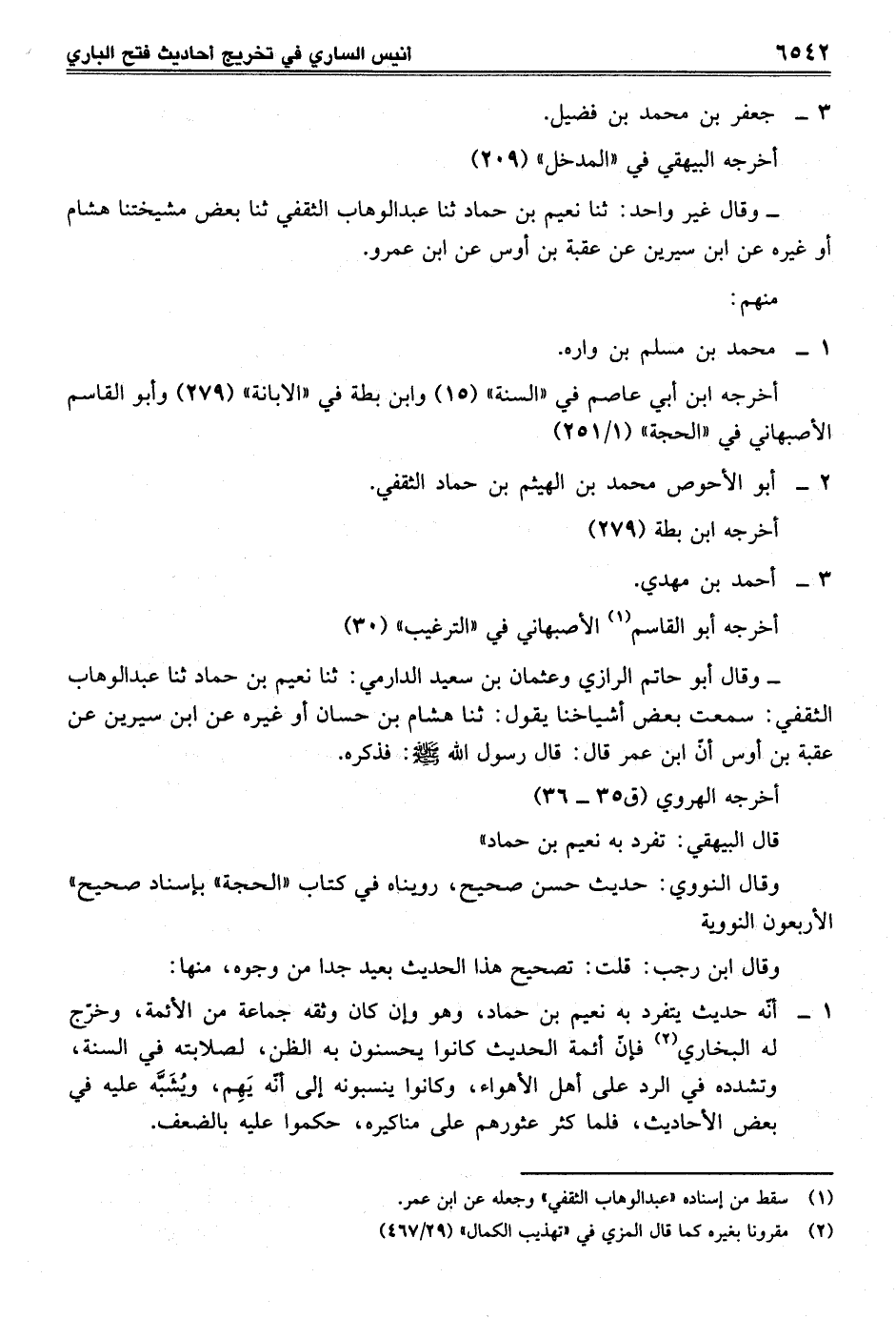 - وقال غير واحد: ثنا نعيم بن حماد ثنا عبد الوهاب الثقفي ثنا بعض مشيختنا هشام أو غيره عن ابن سيرين عن عقبة بن أوس عن ابن عمرو.
