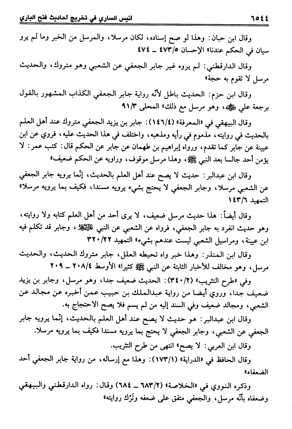 وقال ابن حزم: الحديث باطل لأنّه رواية جابر الجعفي الكذاب المشهور بالقول برجعة علي - رضي الله عنه -، وهو مرسل مع ذلك" المحلى 3/ 91