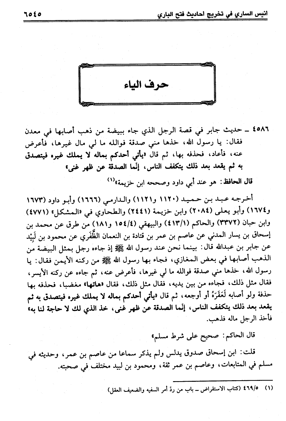 4586 - حديث جابر في قصة الرجل الذي جاء ببيضة من ذهب أصابها في معدن فقال: يا رسول الله، خذها مني صدقة فوالله ما لي مال غيرها، فأعرض عنه، فأعاد، فحذفه بها، ثم قال "يأتي أحدكم بماله لا يملك غيره فيتصدق به ثم يقعد بعد ذلك يتكفف الناس، إنّما الصدقة عن ظهر غنى"