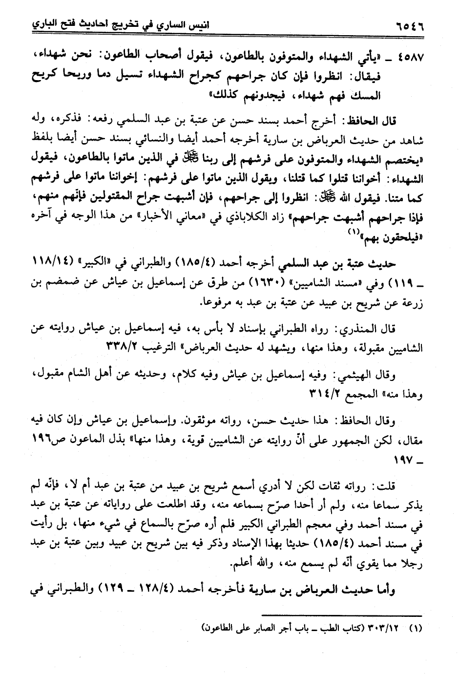 قال الحافظ: أخرج أحمد بسند حسن عن عتبة بن عبد السلمي رفعه: فذكره، وله شاهد من حديث العرباض بن سارية أخرجه أحمد أيضًا والنسائي بسند حسن أيضًا بلفظ "يختصم الشهداء والمتوفون على فرشهم إلى ربنا -عز وجل- في الذين ماتوا بالطاعون، فيقول الشهداء: أخواننا قتلوا كما قتلنا، ويقول الذين ماتوا على فرشهم: إخواننا ماتوا على فرشهم كما متنا. فيقول الله-عز وجل-: انظروا إلى جراحهم، فإن أشبهت جراح المقتولين فإنّهم منهم، فإذا جراحهم أشبهت جراحهم" زاد الكلاباذي في "معاني الأخبار" من هذا الوجه في آخره "فيلحقون بهم" (¬1)