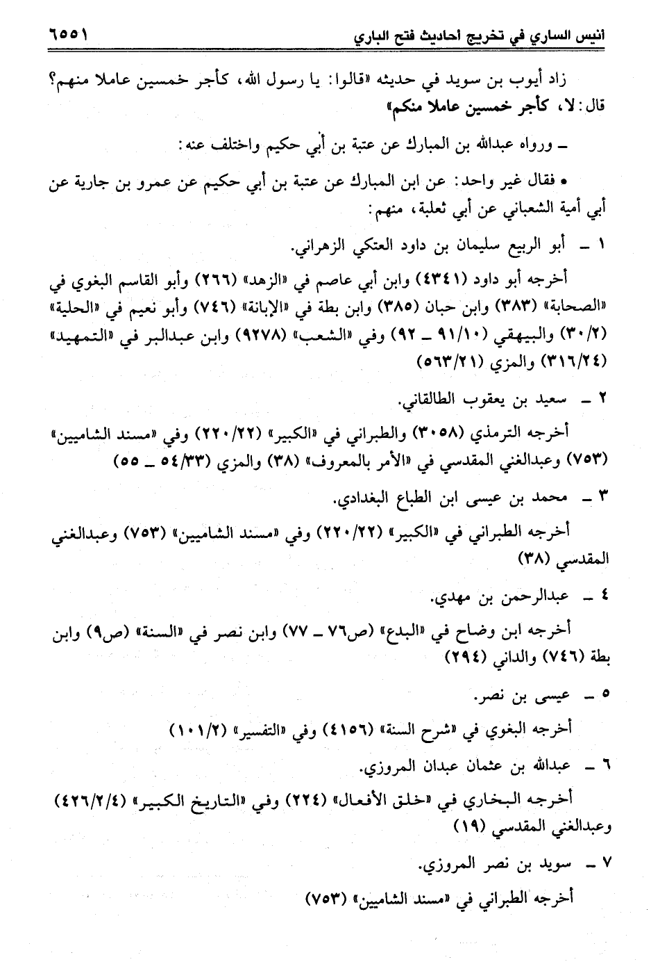 زاد أيوب بن سويد في حديثه "قالوا: يا رسول الله، كأجر خمسين عاملا منهم؟ قال: لا، كأجر خمسين عاملا منكم".