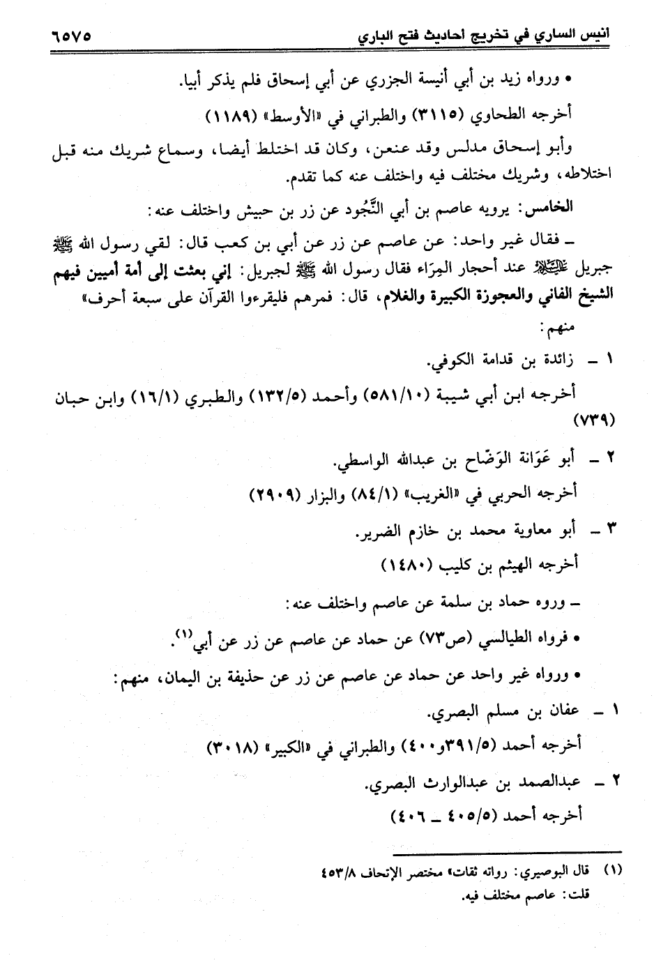 - فقال غير واحد: عن عاصم عن زر عن أبي بن كعب قال: لقي رسول الله -صلى الله عليه وسلم- جبريل عليه السلام عند أحجار المِرَاء فقال رسول الله -صلى الله عليه وسلم- لجبريل: إني بعثت إلى أمة أميين فيهم الشيخ الفاني والعجوزة الكبيرة والغلام، قال: فمرهم فليقرءوا القرآن على سبعة أحرف".