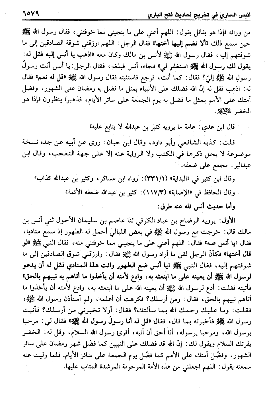من ورائه فإذا هو بقائل يقول: اللهم أعني على ما ينجيني مما خوفتني، فقال رسول الله -صلى الله عليه وسلم- حين سمع ذلك "ألا تضم إليها أختها" فقال الرجل: اللهم ارزقني شوقة الصادقين إلى ما شوقتهم إليه، فقال رسول الله -صلى الله عليه وسلم- لأنس بن مالك وكان معه "اذهب يا أنس إليه فقل له: يقول لك رسول الله -صلى الله عليه وسلم- استغفر لي" فجاءه أنس فبلغه، فقال الرجل: يا أنس أنت رسولُ رسولِ الله -صلى الله عليه وسلم- إليّ؟ فقال: كما أنت، فرجع فاستثبته فقال رسول الله -صلى الله عليه وسلم- "قل له نعم" فقال له: اذهب فقل له إنّ الله فضلك على الأنبياء بمثل ما فضل به رمضان على الشهور، وفضل أمتك على الأمم بمثل ما فضل به يوم الجمعة على سائر الأيام، فذهبوا ينظرون فإذا هو الخضر: عليه السلام.