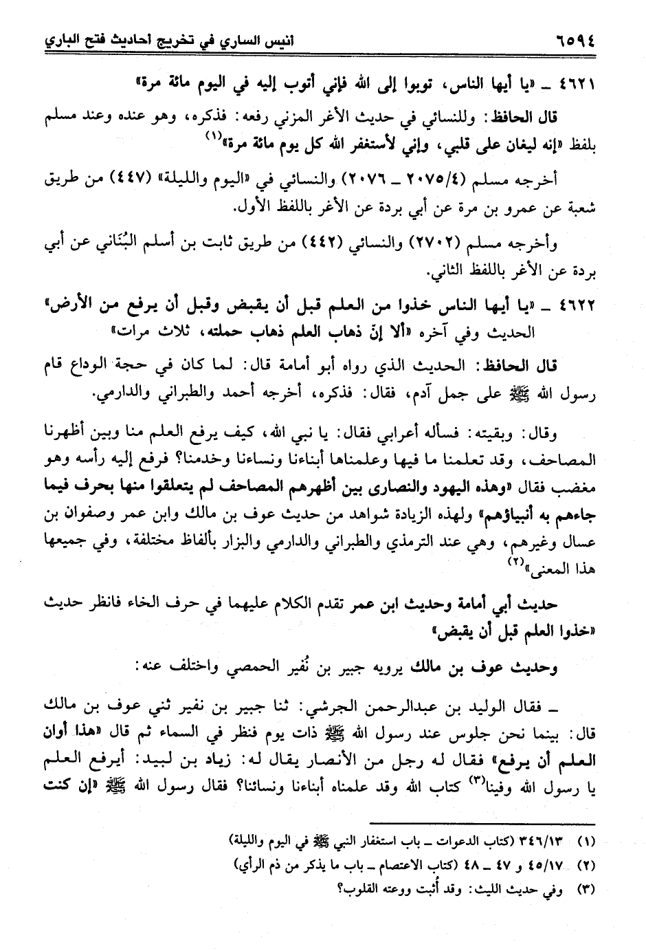 4622 - "يا أيها الناس خذوا من العلم قبل أن يقبض وقبل أن يرفع من الأرض". الحديث وفي آخره "ألا إن ذهاب العلم ذهاب حملته، ثلاث مرات".