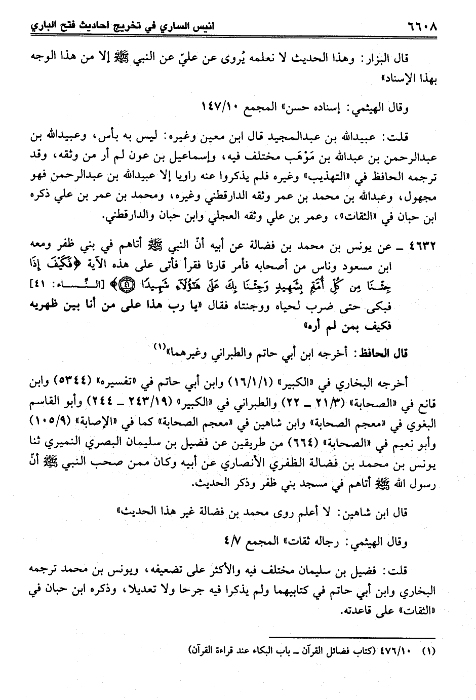 4632 - عن يونس بن محمد بن فضالة عن أبيه أن النبي -صلى الله عليه وسلم- أتاهم في بني ظفر ومعه ابن مسعود وناس من أصحابه فأمر قارئا فقرأ فأتى على هذه الآية {فَكَيْفَ إِذَا جِئْنَا مِنْ كُلِّ أُمَّةٍ بِشَهِيدٍ وَجِئْنَا بِكَ عَلَى هَؤُلَاءِ شَهِيدًا (41)} [النساء: 41] فبكى حتى ضرب لحياه ووجنتاه فقال "يا رب هذا على من أنا بين ظهريه فكيف بمن لم أره".
