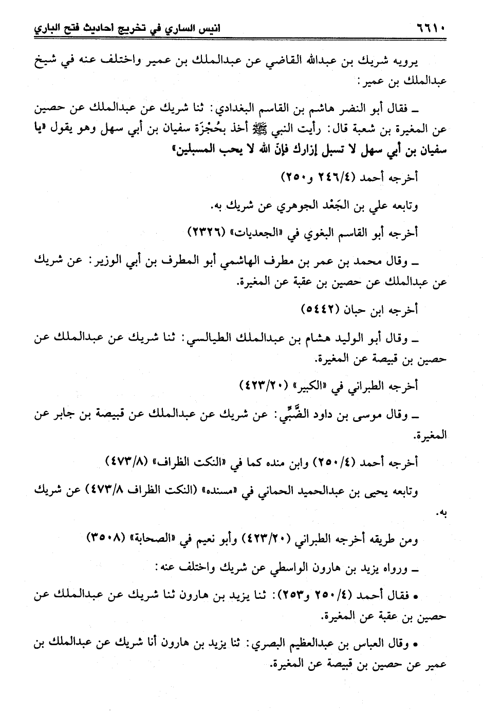- فقال أبو النضر هاشم بن القاسم البغدادي: ثنا شريك عن عبد الملك عن حصين عن المغيرة بن شعبة قال: رأيت النبي -صلى الله عليه وسلم- أخذ بحُجْزَة سفيان بن أبي سهل وهو يقول "يا سفيان بن أبي سهل لا تسبل إزارك فإنّ الله لا يحب المسبلين".