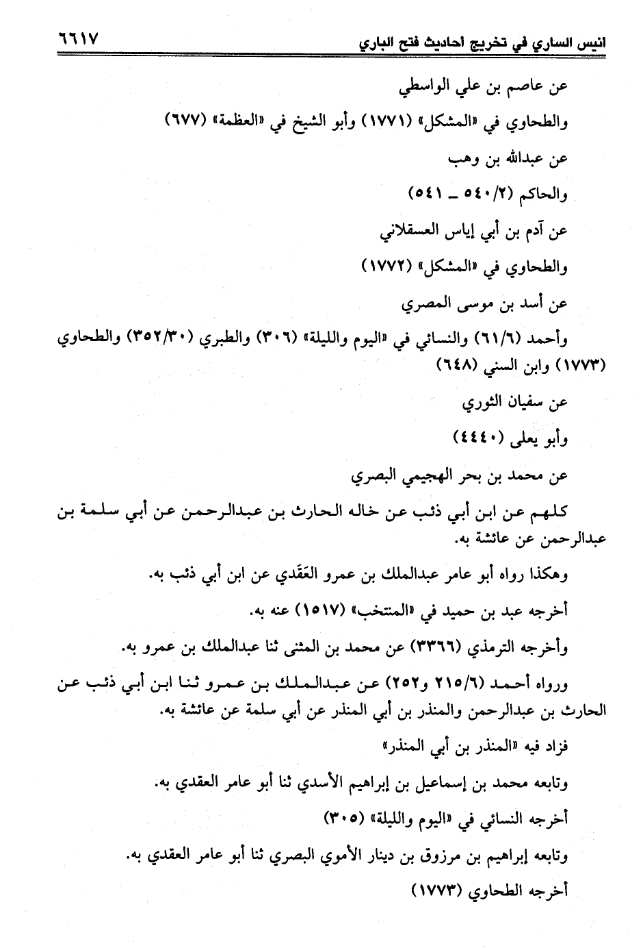 عن عاصم بن علي الواسطي والطحاوي في "المشكل" (1771) وأبو الشيخ في "العظمة" (677) عن عبد الله بن وهب والحاكم (2/ 540 - 541) عن آدم بن أبي إياس العسقلاني والطحاوي في "المشكل" (1772) عن أسد بن موسى المصري وأحمد (6/ 61) والنسائي في "اليوم والليلة" (306) والطبري (30/ 352) والطحاوي (1773) وابن السني (648) عن سفيان الثوري وأبو يعلى (4440) عن محمد بن بحر الهجيمي البصري كلهم عن ابن أبي ذئب عن خاله الحارث بن عبد الرحمن عن أبي سلمة بن عبد الرحمن عن عائشة به.