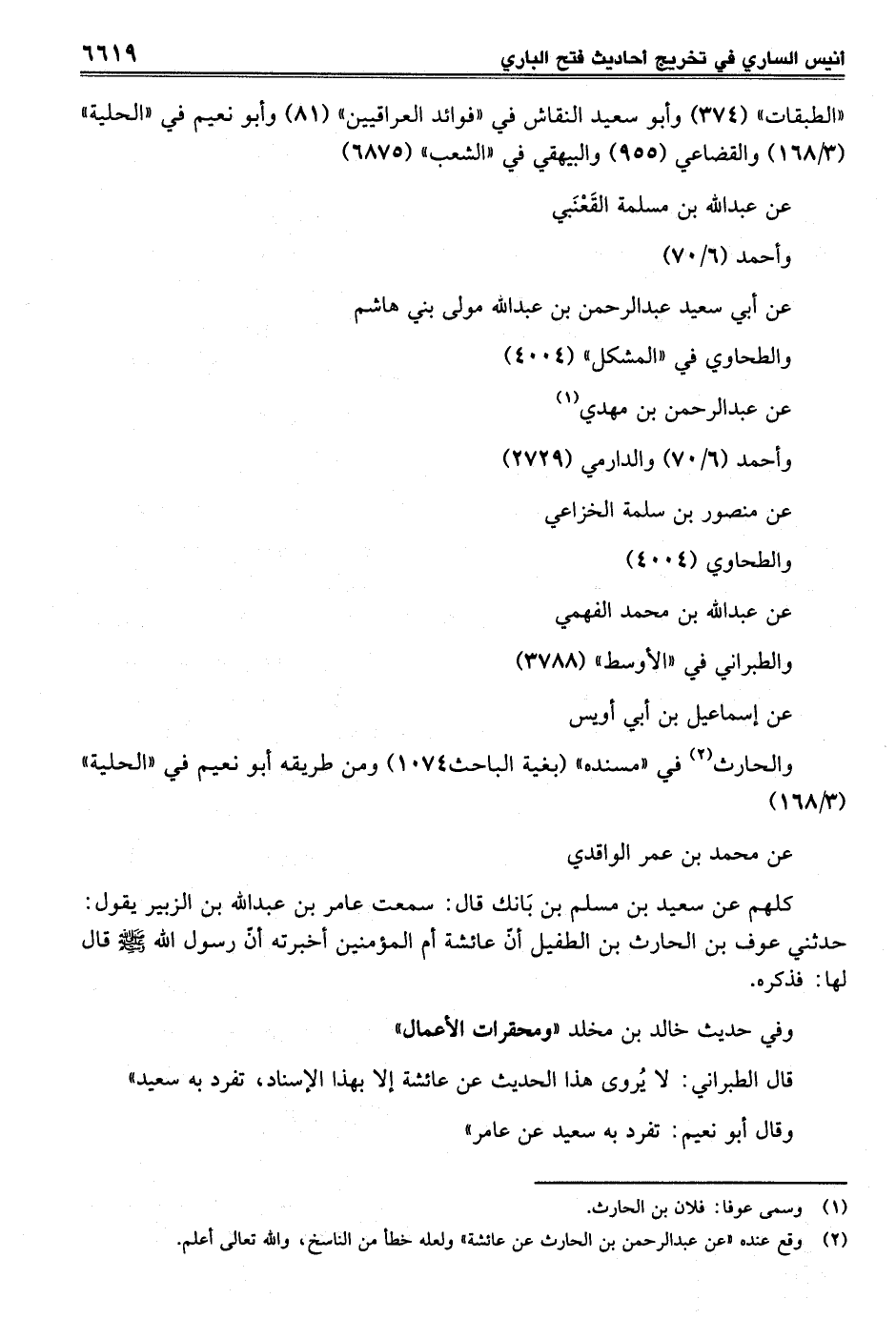 "الطبقات" (374) وأبو سعيد النقاش في "فوائد العراقيين" (81) وأبو نعيم في "الحلية" (3/ 168) والقضاعي (955) والبيهقي في "الشعب" (6875) عن عبد الله بن مسلمة القَعْنَبي وأحمد (6/ 70) عن أبي سعيد عبد الرحمن بن عبد الله مولى بني هاشم والطحاوي في "المشكل" (4004) عن عبد الرحمن بن مهدي (¬1) وأحمد (6/ 70) والدارمي (2729) عن منصور بن سلمة الخزاعي والطحاوي (4004) عن عبد الله بن محمد الفهمي والطبراني في "الأوسط" (3788) عن إسماعيل بن أبي أويس والحارث (¬2) في "مسنده" (بغية الباحث 1074) ومن طريقه أبو نعيم في "الحلية" (3/ 168) عن محمد بن عمر الواقدي كلهم عن سعيد بن مسلم بن بَانك قال: سمعت عامر بن عبد الله بن الزبير يقول: حدثني عوف بن الحارث بن الطفيل أن عائشة أم المؤمنين أخبرته أنْ رسول الله -صلى الله عليه وسلم- قال لها: فذكره.