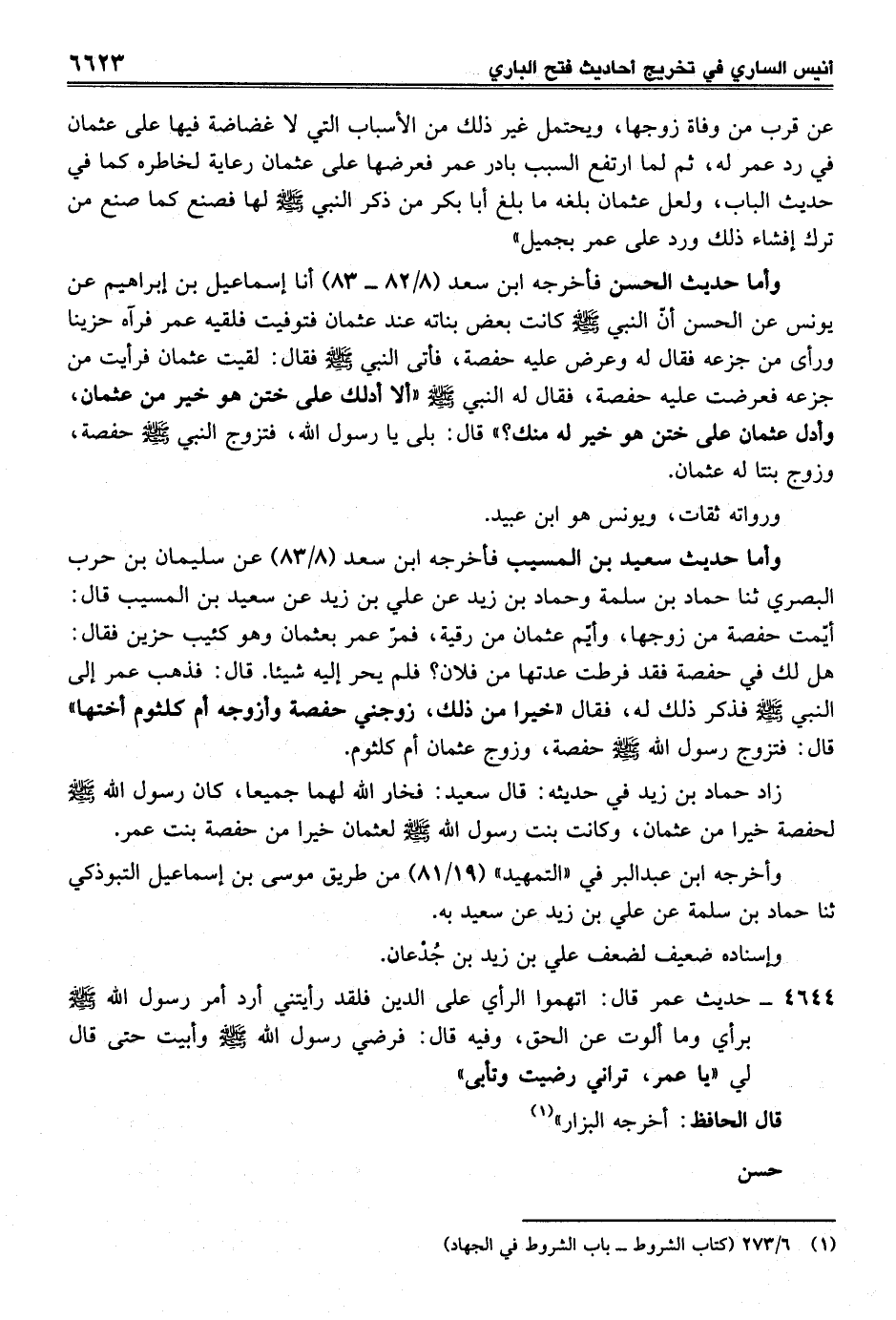 زاد حماد بن زيد في حديثه: قال سعيد: فخار الله لهما جميعًا، كان رسول الله -صلى الله عليه وسلم- لحفصة خيرا من عثمان، وكانت بنت رسول الله -صلى الله عليه وسلم- لعثمان خيرا من حفصة بنت عمر.