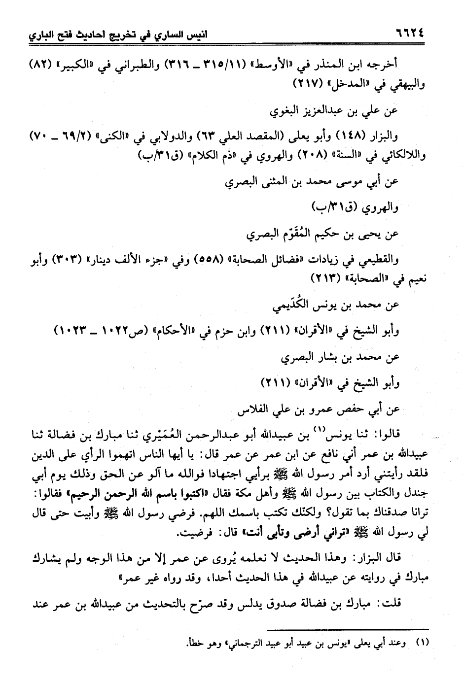 قالوا: ثنا يونس (¬1) بن عبيد الله أبو عبد الرحمن العُمَيْري ثنا مبارك بن فضالة ثنا عبيد الله بن عمر أني نافع عن ابن عمر عن عمر قال: يا أيها الناس اتهموا الرأي على الدين فلقد رأيتني أرد أمر رسول الله -صلى الله عليه وسلم- برأيي اجتهادا فوالله ما آلو عن الحق وذلك يوم أبي جندل والكتاب بين رسول الله -صلى الله عليه وسلم- وأهل مكة فقال "اكتبوا باسم الله الرحمن الرحيم" فقالوا: ترانا صدقناك بما تقول؟ ولكنّك تكتب باسمك اللهم. فرضي رسول الله -صلى الله عليه وسلم- وأبيت حتى قال لي رسول الله -صلى الله عليه وسلم- "تراني أرضى وتأبى أنت" قال: فرضيت.