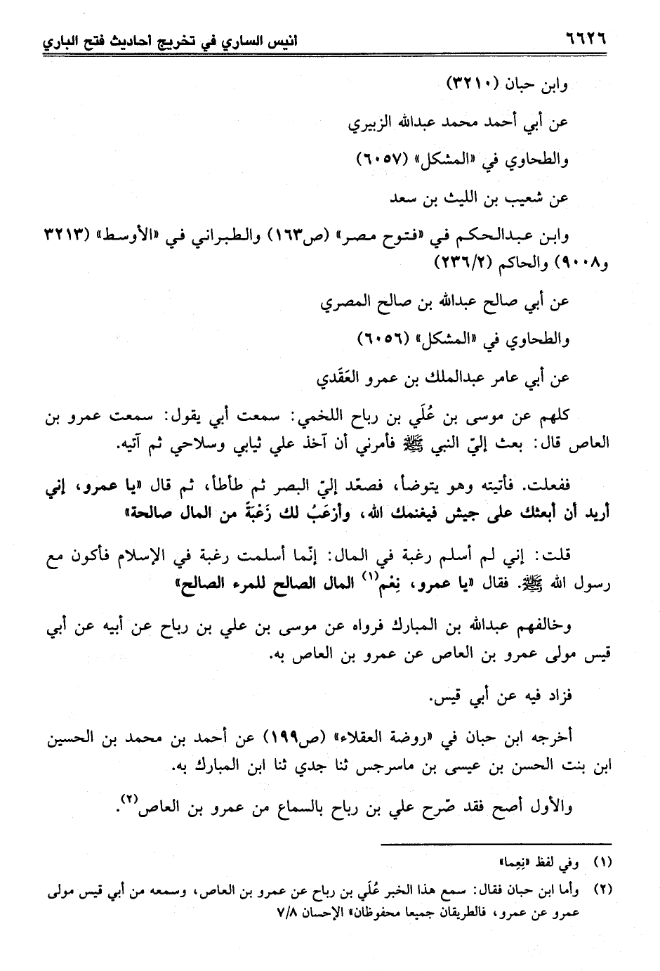 (¬2) وأما ابن حبان فقال: سمع هذا الخبر عُلَي بن رباح عن عمرو بن العاص، وسمعه من أبي قيس مولى عمرو عن عمرو، فالطريقان جميعًا محفوظان" الإحسان 8/ 7.