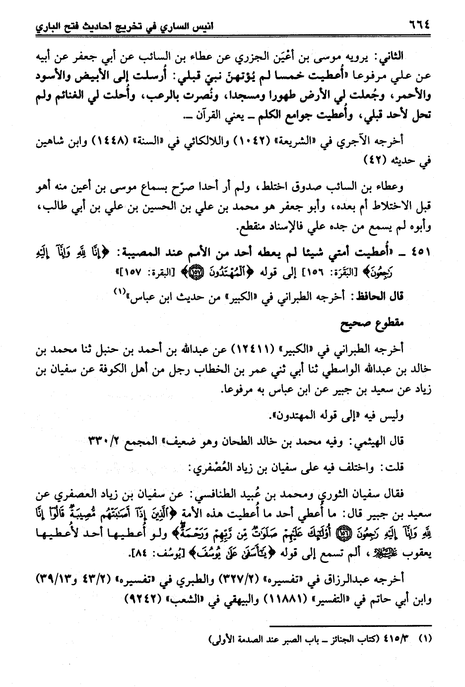 451 - "أُعطيت أمتي شيئا لم يعطه أحد من الأمم عند المصيبة: {إِنَّا لِلَّهِ وَإِنَّا إِلَيْهِ رَاجِعُونَ} [البَقَرَة: 156] إلى قوله {الْمُهْتَدُونَ (157)} [البقرة: 157] "