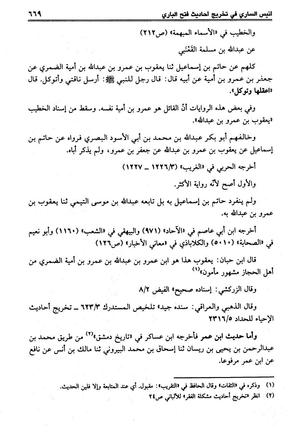 كلهم عن حاتم بن إسماعيل ثنا يعقوب بن عمرو بن عبد الله بن أمية الضمري عن جعفر بن عمرو بن أمية عن أبيه قال: قال رجل للنبي - صلى الله عليه وسلم -: أرسل ناقتي وأتوكل. قال "اعقلها وتوكل".