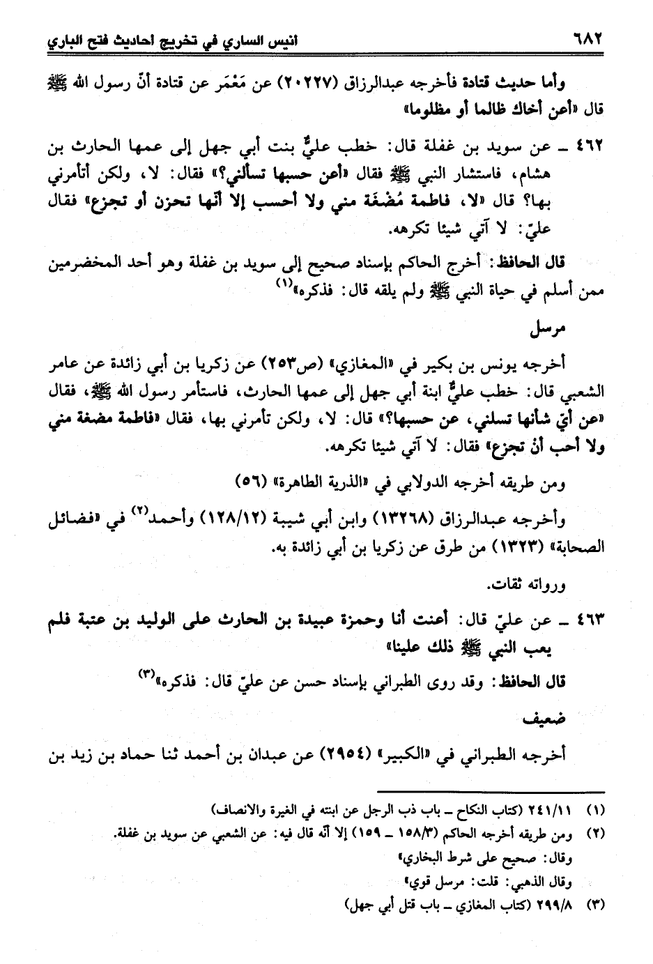 462 - عن سويد بن غفلة قال: خطب عليٌّ بنت أبي جهل إلى عمها الحارث بن هشام، فاستشار النبي - صلى الله عليه وسلم - فقال "أعن حسبها تسألني؟ " فقال: لا, ولكن أتأمرنى بها؟ قال "لا، فاطمة مُضغَة مني ولا أحسب إلا أنّها تحزن أو تجزع" فقال عليّ: لا آتي شيئا تكرهه.