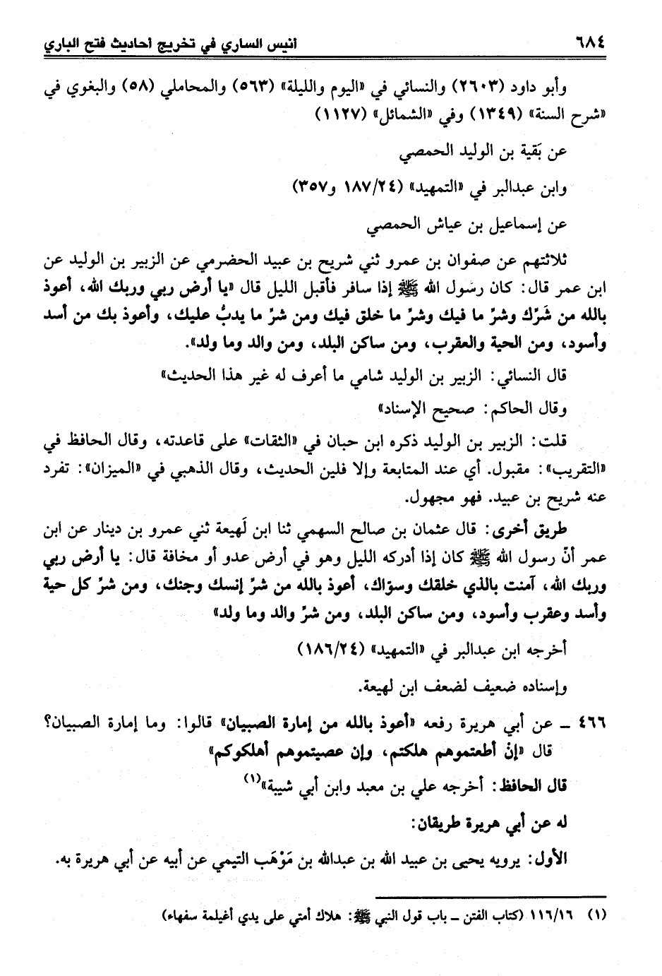 طريق أخرى: قال عثمان بن صالح السهمي ثنا ابن لَهيعة ثني عمرو بن دينار عن ابن عمر أنْ رسول الله - صلى الله عليه وسلم - كان إذا أدركه الليل وهو في أرض عدو أو مخافة قال: يا أرض ربي وربك الله، آمنت بالذي خلقك وسوّاك، أعوذ بالله من شرّ إنسك وجنك، ومن شرّ كل حية وأسد وعقرب وأسود، ومن ساكن البلد، ومن شرِّ والد وما ولد"