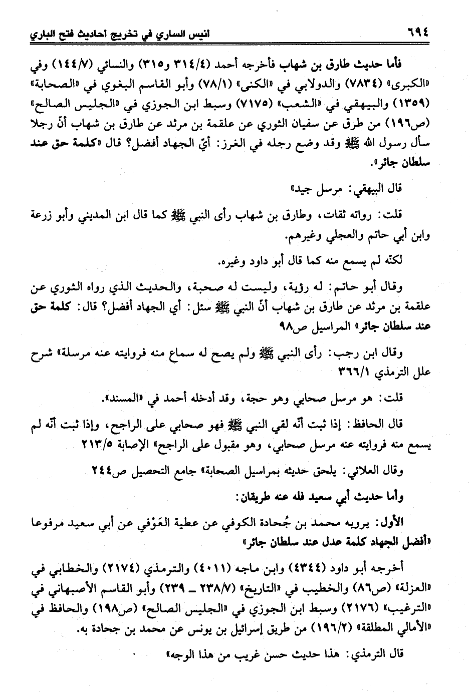 فأما حديث طارق بن شهاب فأخرجه أحمد (4/ 314 و 315) والنسائي (7/ 144) وفي "الكبرى" (7834) والدولابي في "الكنى" (1/ 78) وأبو القاسم البغوي في "الصحابة" (1359) والبيهقي في "الشعب" (7175) وسبط ابن الجوزي في "الجليس الصالح" (ص 196) من طرق عن سفيان الثوري عن علقمة بن مرثد عن طارق بن شهاب أنّ رجلا سأل رسول الله - صلى الله عليه وسلم - وقد وضع رجله في الغرز: أيّ الجهاد أفضل؟ قال "كلمة حق عند سلطان جائر".