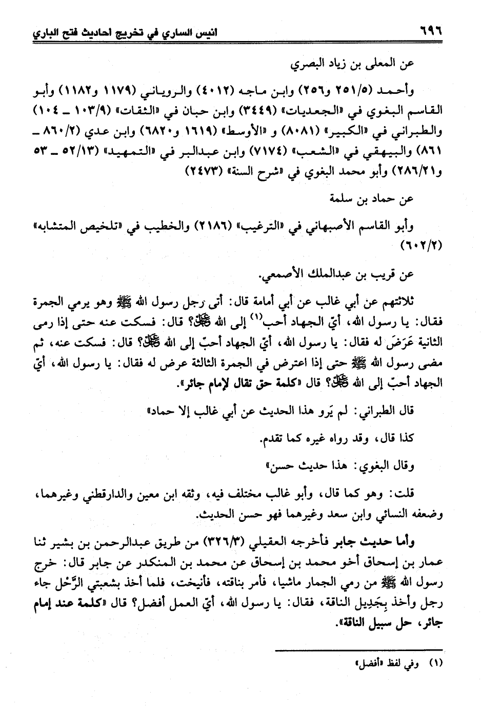 وأما حديث جابر فأخرجه العقيلي (3/ 326) من طريق عبد الرحمن بن بشير ثنا عمار بن إسحاق أخو مُحَمَّدْ بن إسحاق عن مُحَمَّدْ بن المنكدر عن جابر قال: خرج رسول الله - صلى الله عليه وسلم - من رمي الجمار ماشيا، فأمر بناقته، فأنيخت، فلما أخذ بشعبتي الرَّحْل جاء رجل وأخذ بِجَدِيل الناقة، فقال: يا رسول الله، أيّ العمل أفضل؟ قال "كلمة عند امام جائر، حل سبيل الناقة".