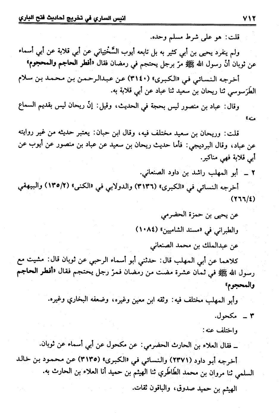 ولم ينفرد يحيى بن أبي كثير به بل تابعه أيوب السَّخْتِياني عن أبي قلابة عن أبي أسماء عن ثوبان أنّ رسول الله - صلى الله عليه وسلم - مرّ برجل يحتجم في رمضان فقال "أفطر الحاجم والمحجوم"