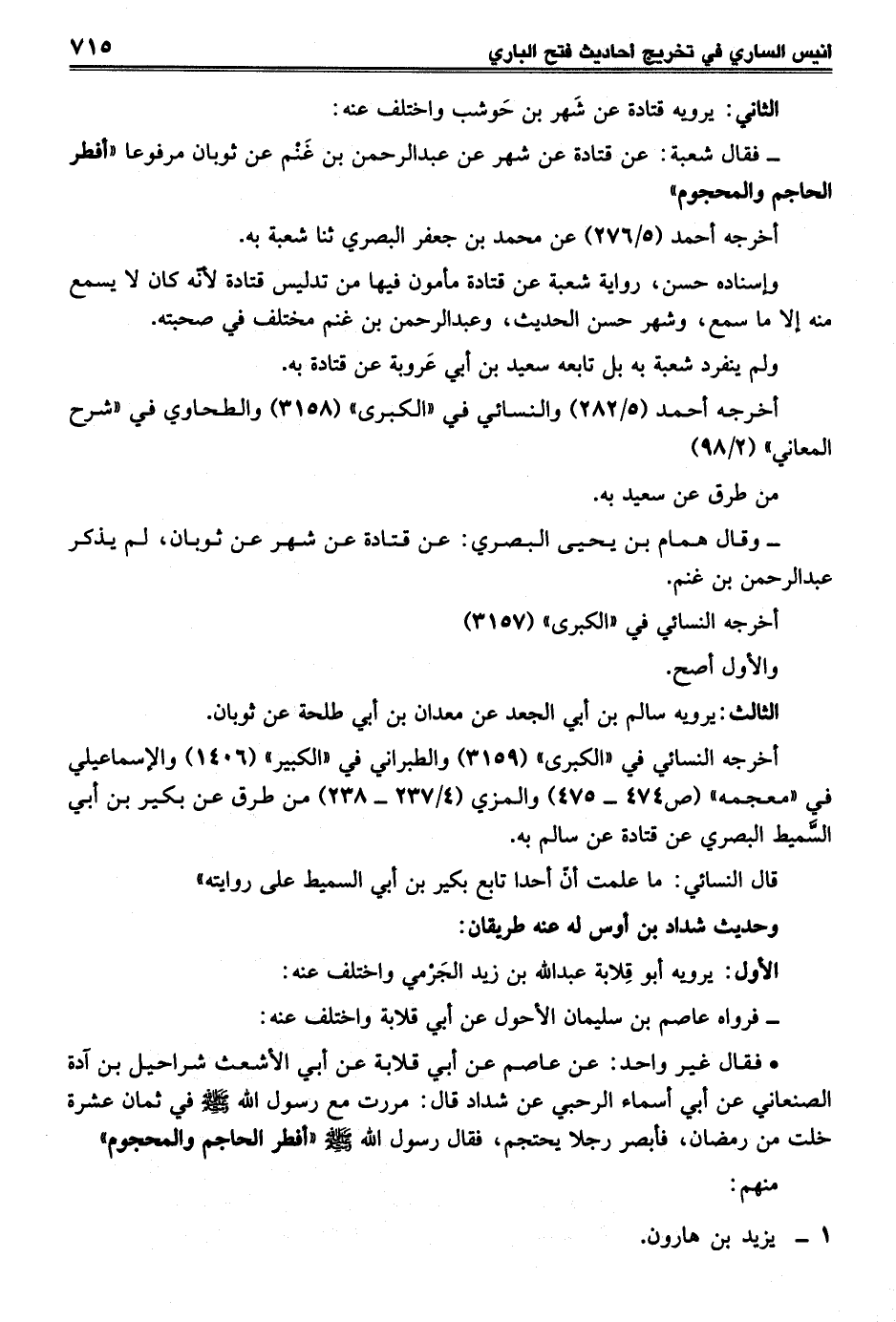 - فقال شعبة: عن قتادة عن شهر عن عبد الرحمن بن غَنْم عن ثوبان مرفوعا "أفطر الحاجم والمحجوم"