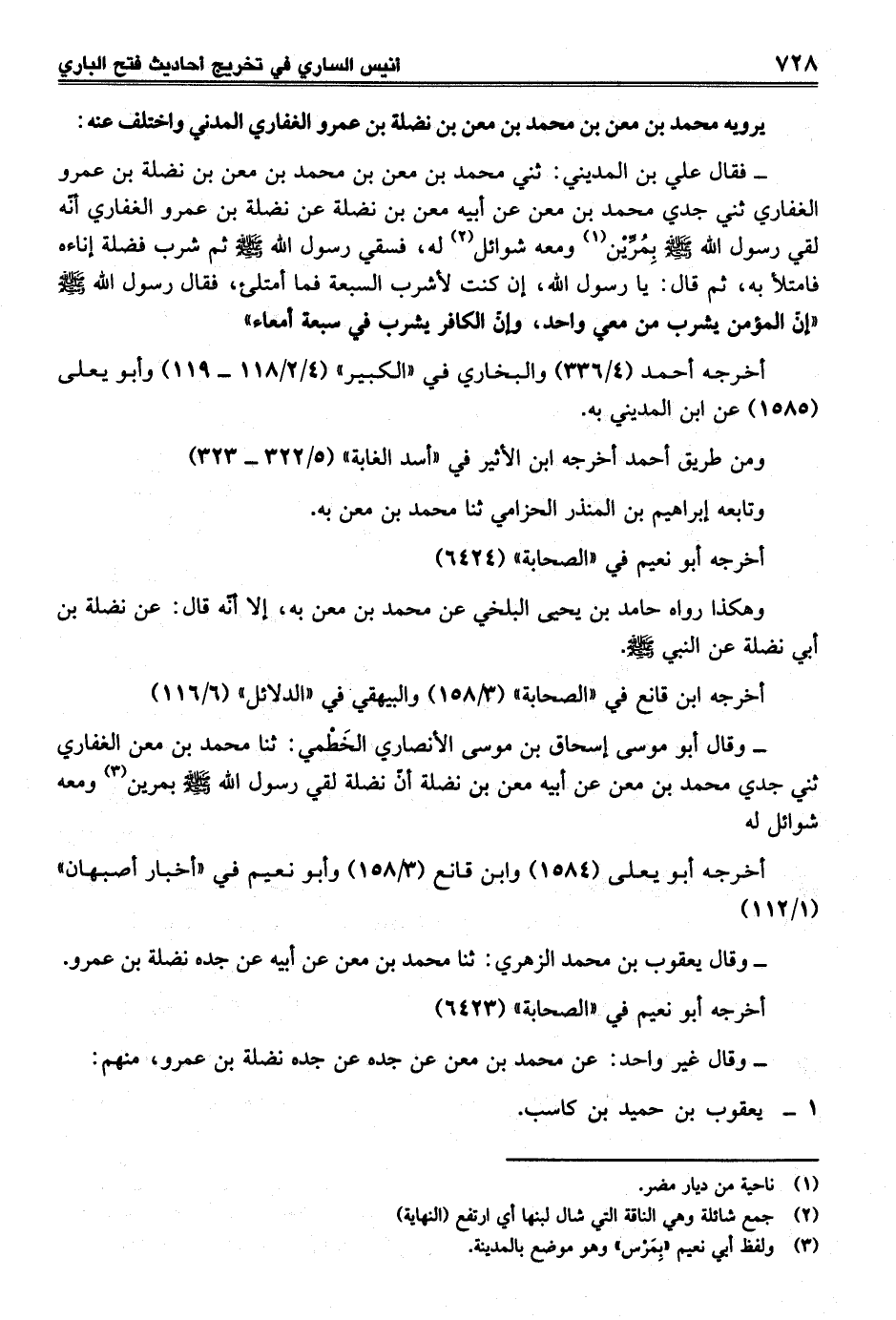 - فقال علي بن المديني: ثني محمد بن معن بن محمد بن معن بن نضلة بن عمرو الغفاري ثني جدي محمد بن معن عن أبيه معن بن نضلة عن نضلة بن عمرو الغفاري أنّه لقي رسول الله - صلى الله عليه وسلم - بِمُرِّيْن (¬1) ومعه شوائل (¬2) له، فسقي رسول الله - صلى الله عليه وسلم - ثم شرب فضلة إناءه فامتلأ به، ثم قال: يا رسول الله، إن كنت لأشرب السبعة فما أمتلئ، فقال رسول الله - صلى الله عليه وسلم - "إنّ المؤمن يشرب من معي واحد، وإنّ الكافر يشرب في سبعة أمعاء"