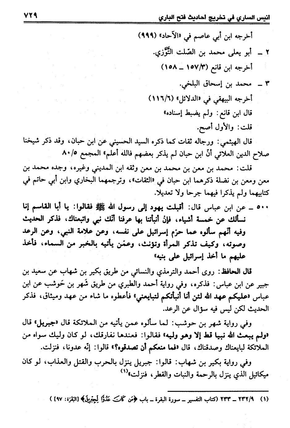 500 - عن ابن عباس قال: أقبلت يهود إلى رسول الله - صلى الله عليه وسلم - فقالوا: يا أبا القاسم إنا نسألك عن خمسة أشياء، فإنْ أنبأتنا بها عرفنا أنّك نبي واتبعناك، فذكر الحديث وفيه أنّهم سألوه عما حرّم إسرائيل على نفسه، وعن علامة النبي، وعن الرعد وصوته، وكيف تذكر المرأة وتؤنث، وعمّن يأتيه بالخبر من السماء، فأخذ عليهم ما أخد إسرائيل على بنيه"