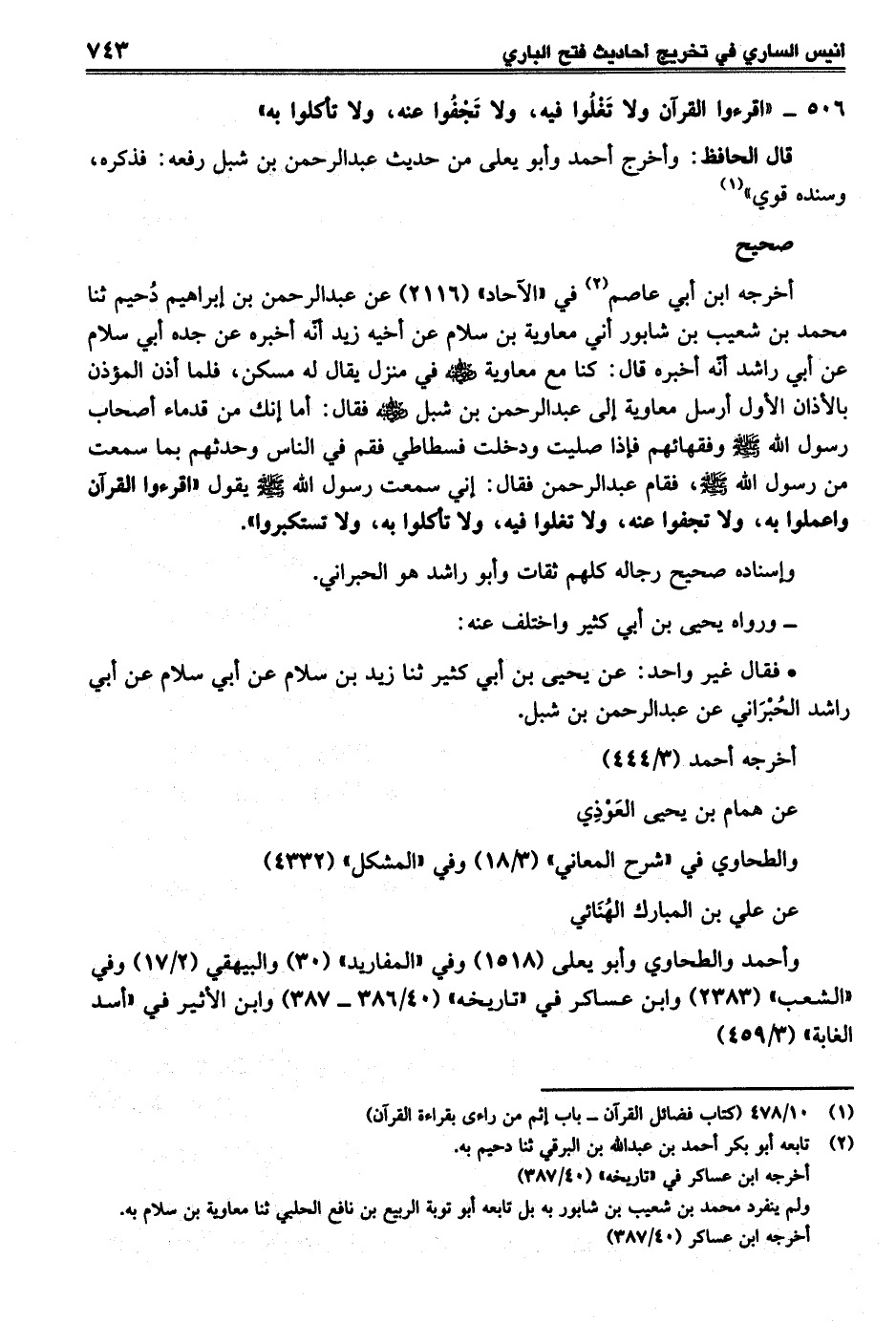 أخرجه ابن أبي عاصم (¬2) في "الآحاد" (2116) عن عبد الرحمن بن إبراهيم دُحيم ثنا محمَّد بن شعيب بن شابور أني معاوية بن سلام عن أخيه زيد أنّه أخبره عن جده أبي سلام عن أبي راشد أنّه أخبره قال: كنا مع معاوية - رضي الله عنه - في منزل يقال له مسكن، فلما أذن المؤذن بالأذان الأول أرسل معاوية إلى عبد الرحمن بن شبل - رضي الله عنه - فقال: أما إنك من قدماء أصحاب رسول الله - صلى الله عليه وسلم - وفقهائهم فإذا صليت ودخلت فسطاطي فقم في الناس وحدثهم بما سمعت من رسول الله - صلى الله عليه وسلم -، فقام عبد الرحمن فقال: إني سمعت رسول الله - صلى الله عليه وسلم - يقول "اقرءوا القرآن واعملوا به، ولا تجفوا عنه، ولا تغلوا فيه، ولا تأكلوا به، ولا تستكبروا".