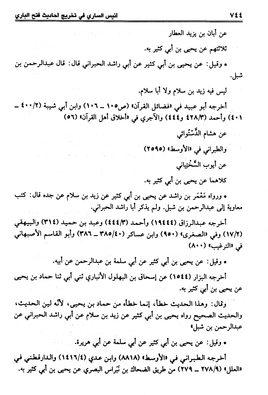 وقال: وهذا الحديث خطأ، إنما خطأه من حماد بن يحيى, لأنّه لين الحديث، والحديث الصحيح رواه يحيى بن أبي كثير عن زيد بن سلام عن أبي راشد الحبراني عن عبد الرحمن بن شبل"