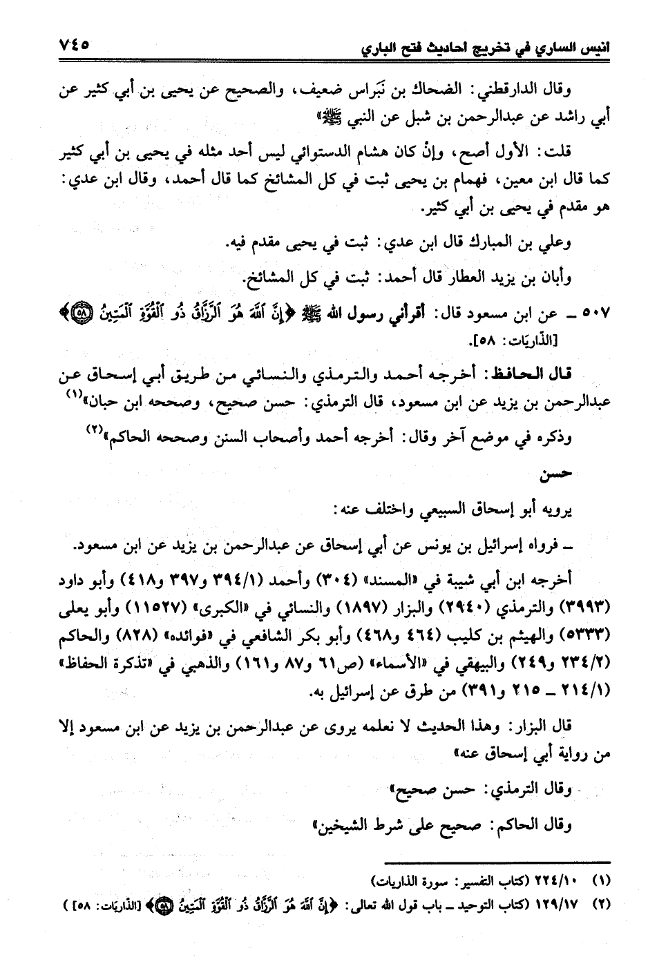 قال الحافظ: أخرجه أحمد والترمذي والنسائي من طريق أبي إسحاق عن عبد الرحمن بن يزيد عن ابن مسعود، قال الترمذي: حسن صحيح، وصححه ابن حبان" (¬1)