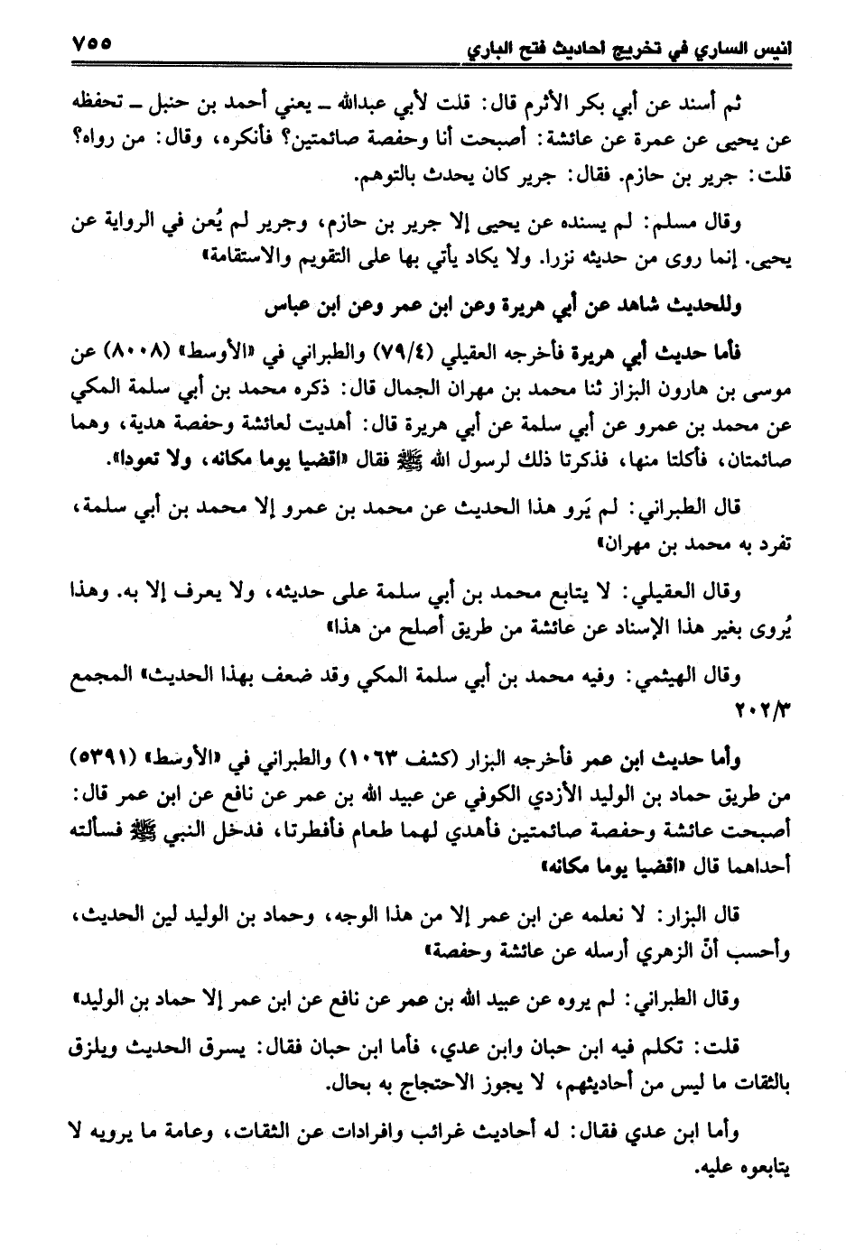 ثم أسند عن أبي بكر الأثرم قال: قلت لأبي عبد الله - يعني أحمد بن حنبل - تحفظه عن يحيى عن عمرة عن عائشة: أصبحت أنا وحفصة صائمتين؟ فأنكره، وقال: من رواه؟ قلت: جرير بن حازم. فقال: جرير كان يحدث بالتوهم.