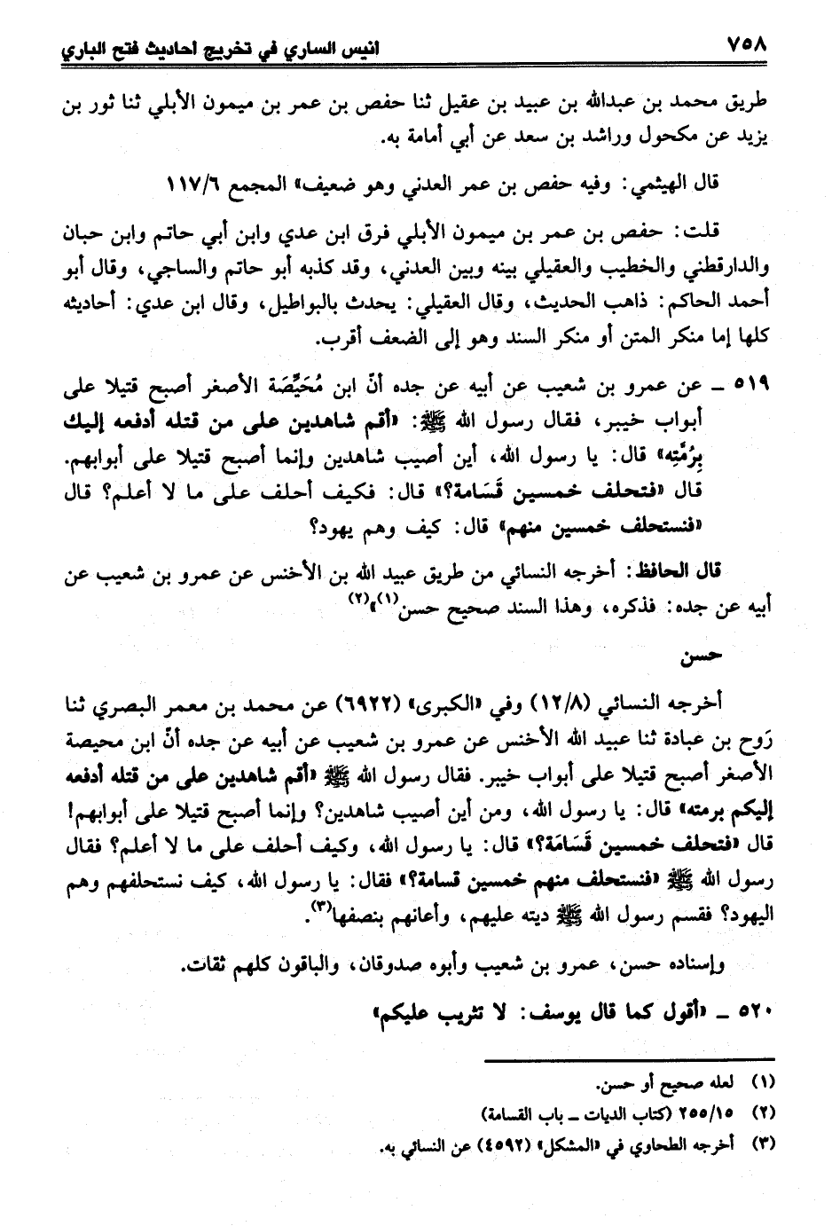 519 - عن عمرو بن شعيب عن أبيه عن جده أنّ ابن مُحَيَّصَة الأصغر أصبح قتيلا على أبواب خيبر، فقال رسول الله - صلى الله عليه وسلم -: "أقم شاهدين على من قتله أدفعه إليك بِرُمَّتِه" قال: يا رسول الله، أين أصيب شاهدين وإنما أصبح قتيلا على أبوابهم. قال "فتحلف خمسين قَسَامة؟ " قال: فكيف أحلف على ما لا أعلم؟ قال "فنستحلف خمسين منهم" قال: كيف وهم يهود؟