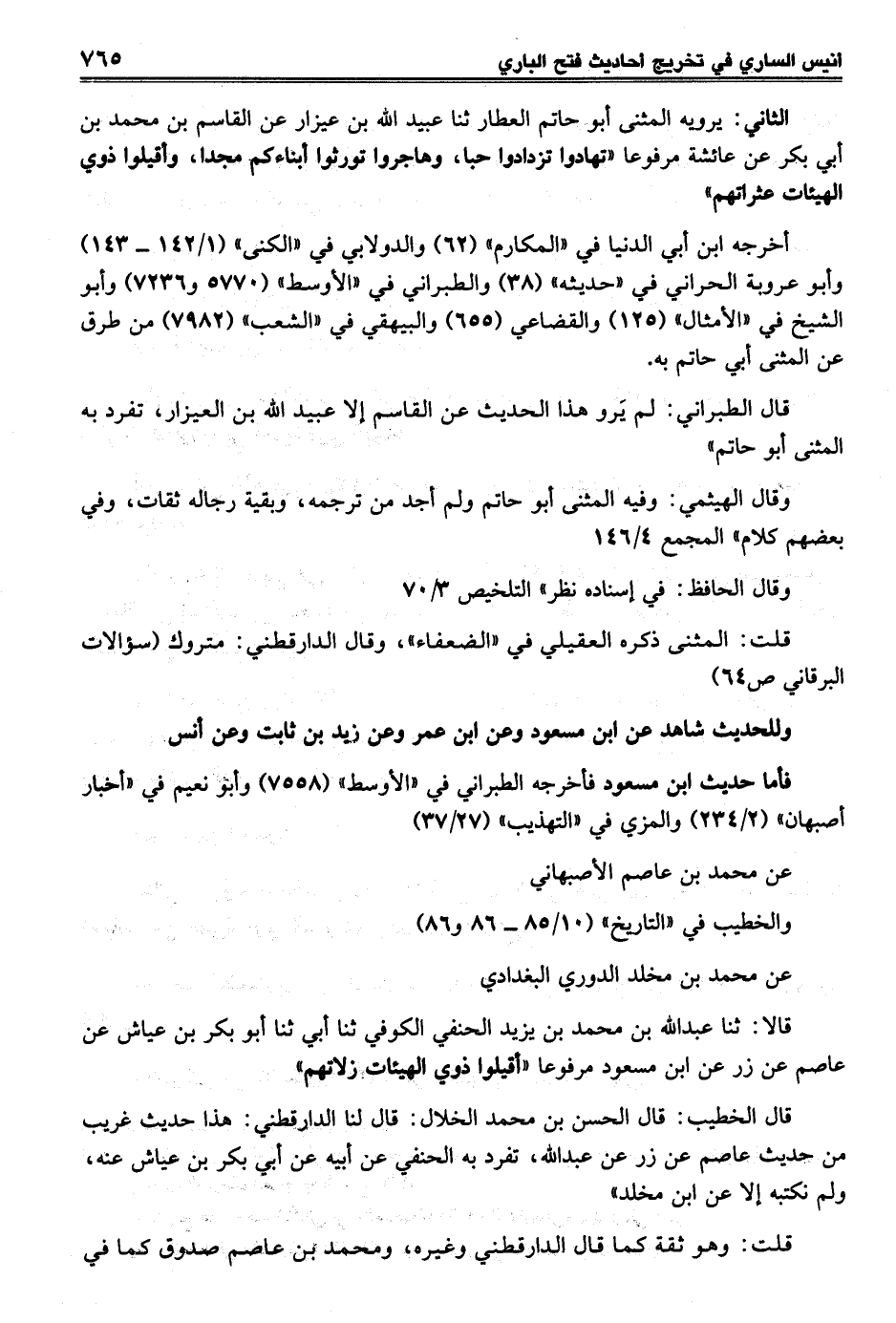 قالا: ثنا عبد الله بن محمد بن يزيد الحنفي الكوفي ثنا أبي ثنا أبو بكر بن عياش عن عاصم عن زر عن ابن مسعود مرفوعا "أقيلوا ذوي الهيئات زلاتهم"
