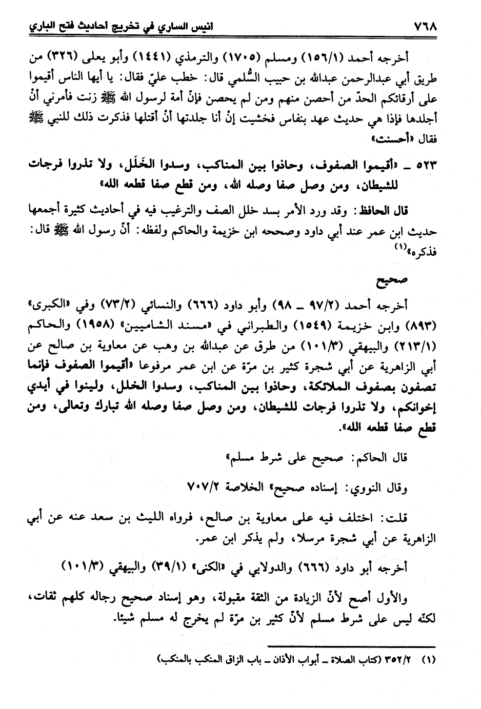 523 - "أقيموا الصفوف، وحاذوا بين المناكب، وسدوا الخَلَل، ولا تذروا فرجات للشيطان، ومن وصل صفا وصله الله، ومن قطع صفا قطعه الله"
