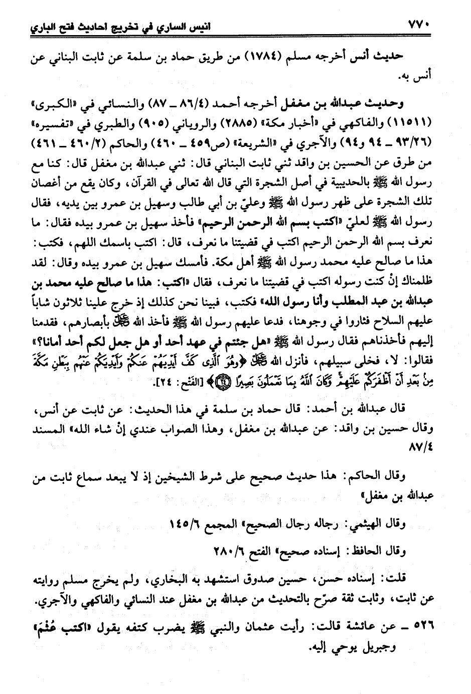 وحديث عبد الله بن مغفل أخرجه أحمد (4/ 86 - 87) والنسائي في "الكبرى" (11511) والفاكهي في "أخبار مكة" (2885) والروياني (905) والطبري في "تفسيره" (26/ 93 - 94 و 94) والآجري في "الشريعة" (ص 459 - 460) والحاكم (2/ 460 - 461) من طرق عن الحسين بن واقد ثني ثابت البناني قال: ثني عبد الله بن مغفل قال: كنا مع رسول الله - صلى الله عليه وسلم - بالحديبية في أصل الشجرة التي قال الله تعالى في القرآن، وكان يقع من أغصان تلك الشجرة على ظهر رسول الله - صلى الله عليه وسلم - وعليّ بن أبي طالب وسهيل بن عمرو بين يديه، فقال رسول الله - صلى الله عليه وسلم - لعليّ "اكتب بسم الله الرحمن الرحيم" فأخذ سهيل بن عمرو بيده فقال: ما نعرف بسم الله الرحمن الرحيم اكتب في قضيتنا ما نعرف، قال: اكتب باسمك اللهم، فكتب: هذا ما صالح عليه محمد رسول الله - صلى الله عليه وسلم - أهل مكة. فأمسك سهيل بن عمرو بيده وقال: لقد ظلمناك إنْ كنت رسوله اكتب في قضيتنا ما نعرف، فقال "اكتب: هذا ما صالح عليه محمد بن عبد الله بن عبد المطلب وأنا رسول الله" فكتب، فبينا نحن كذلك إذ خرج علينا ثلاثون شاباً عليهم السلاح فثاروا في وجوهنا، فدعا عليهم رسول الله - صلى الله عليه وسلم - فأخذ الله - عز وجل - بأبصارهم، فقدمنا إليهم فأخذناهم فقال رسول الله - صلى الله عليه وسلم - "هل جئتم في عهد أحد أو هل جعل لكم أحد أمانا؟ " فقالوا: لا، فخلى سبيلهم، فأنزل الله - عز وجل - {وَهُوَ الَّذِي كَفَّ أَيْدِيَهُمْ عَنْكُمْ وَأَيْدِيَكُمْ عَنْهُمْ بِبَطْنِ مَكَّةَ مِنْ بَعْدِ أَنْ أَظْفَرَكُمْ عَلَيْهِمْ وَكَانَ اللَّهُ بِمَا تَعْمَلُونَ بَصِيرًا (24)} [الفَتْح: 24].