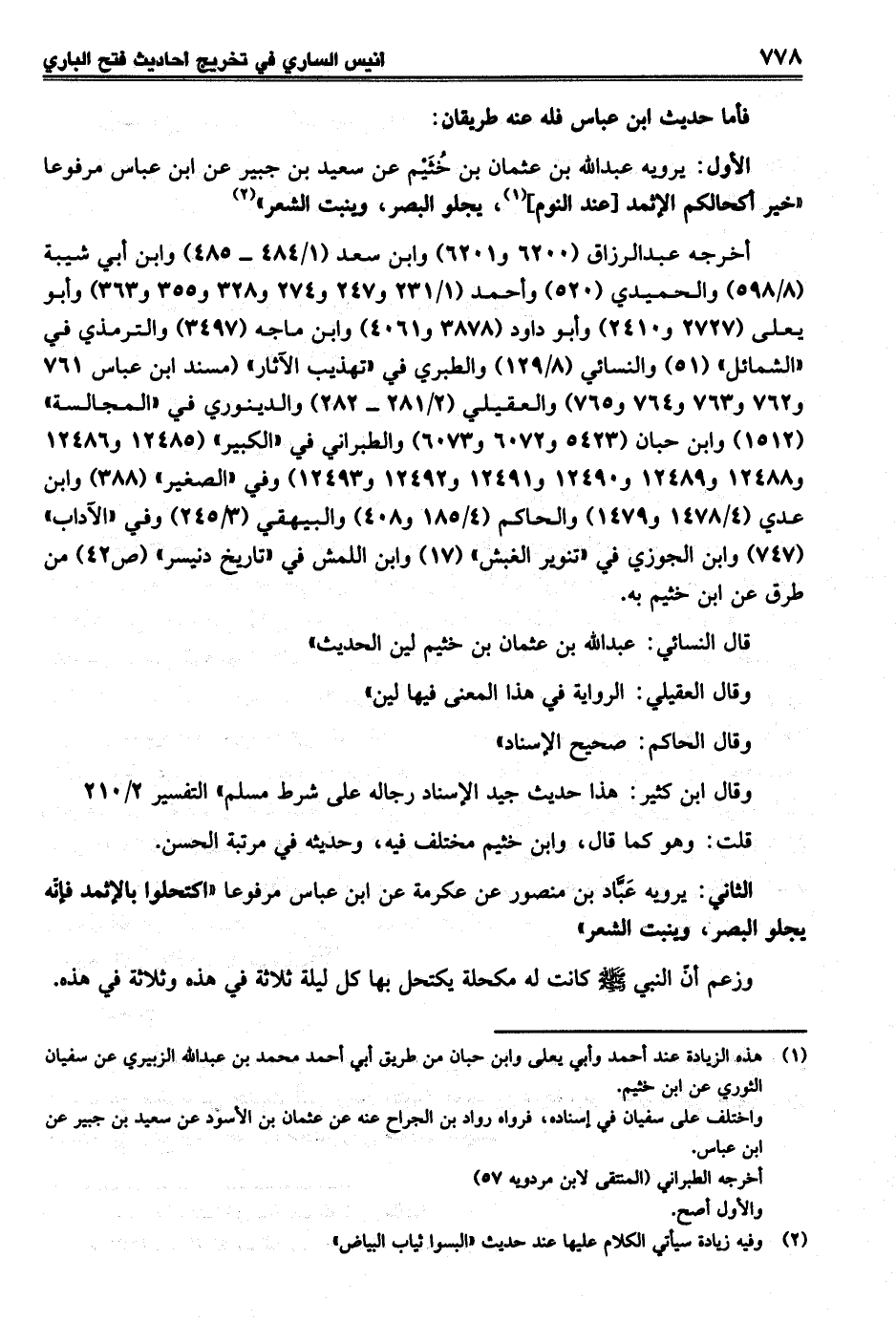الأول: يرويه عبد الله بن عثمان بن خُثَيْم عن سعيد بن جبير عن ابن عباس مرفوعا "خير أكحالكم الإثمد [عند النوم] (¬1)، يجلو البصر، وينبت الشعر" (¬2)