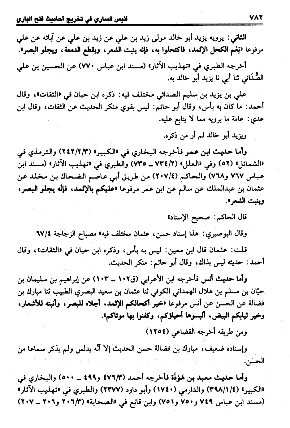 وأما حديث ابن عمر فأخرجه البخاري في "الكبير" (3/ 2/ 242) والترمذي في "الشمائل" (52) وفي "العلل" (2/ 734 - 735) والطبري في "تهذيب الآثار" (مسند ابن عباس 767 و768) والحاكم (4/ 207) من طريق أبي عاصم الضحاك بن مخلد عن عثمان بن عبد الملك عن سالم عن ابن عمر مرفوعاً "عليكم بالإثمد، فإنّه يجلو البصر، وينبت الشعر".