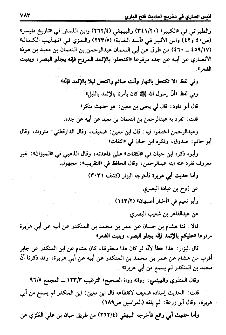 قالا: ثنا هشام بن حسان عن عمر بن محمد بن المنكدر عن أبيه عن أبي هريرة مرفوعاً "عليكم بالإثمد فإنّه يجلو البصر، وينبت الشعر"
