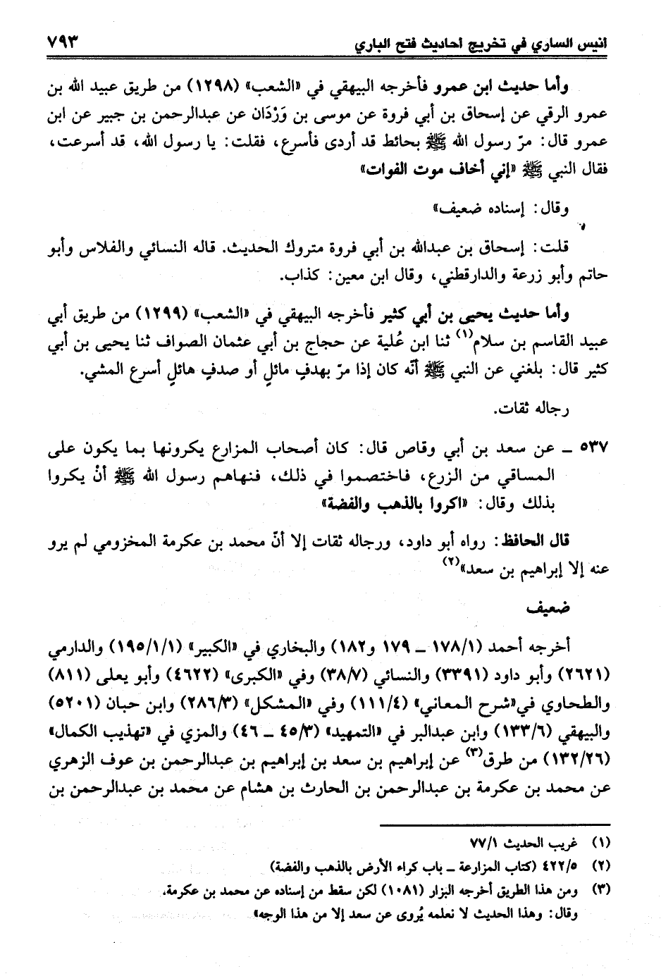 537 - عن سعد بن أبي وقاص قال: كان أصحاب المزارع يكرونها بما يكون على المساقي من الزرع، فاختصموا في ذلك، فنهاهم رسول الله - صلى الله عليه وسلم - أنْ يكروا بذلك وقال: "اكروا بالذهب والفضة"
