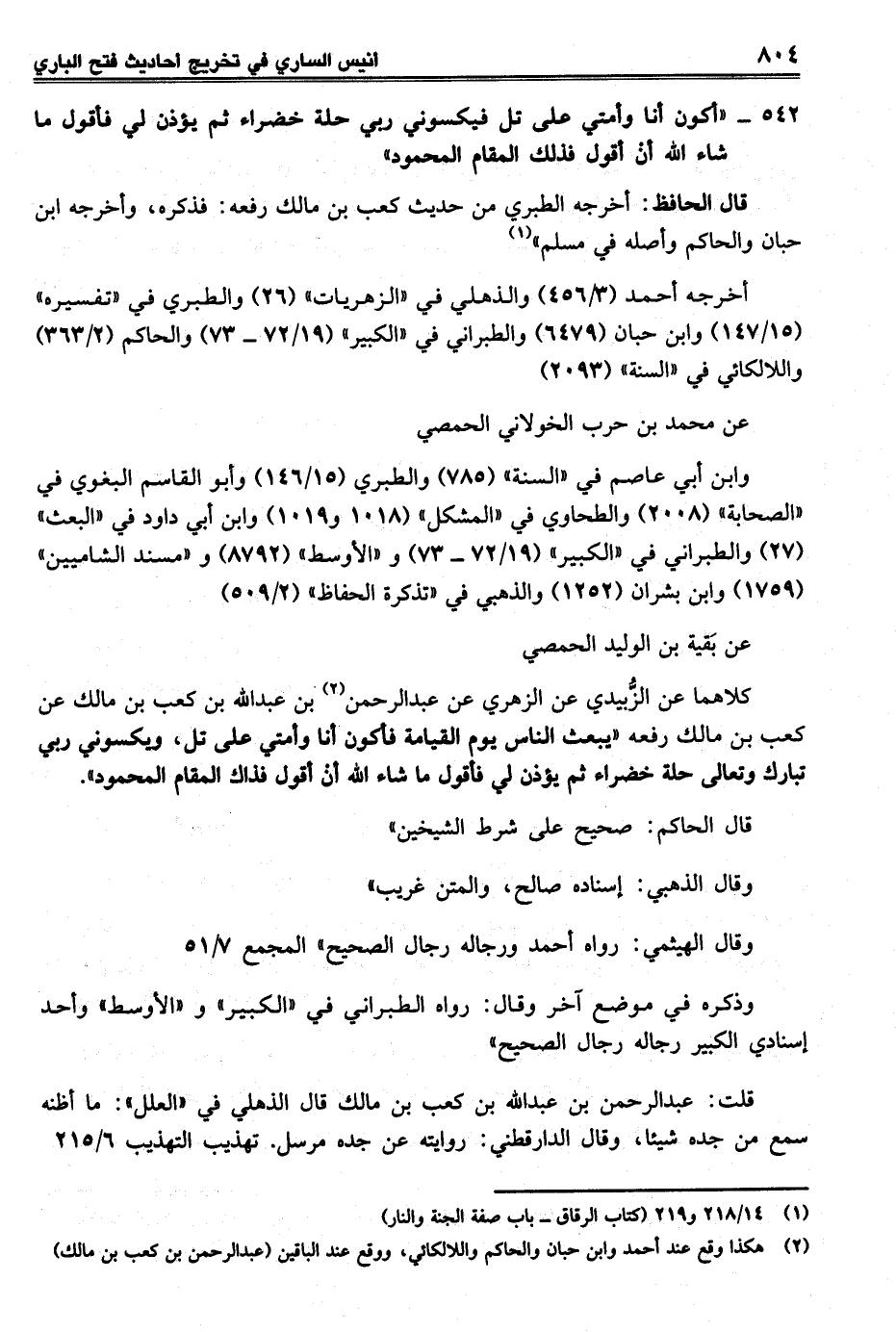 542 - "أكون أنا وأمتي على تل فيكسوني ربي حلة خضراء ثم يؤذن لي فأقول ما شاء الله أنْ أقول فذلك المقام المحمود"